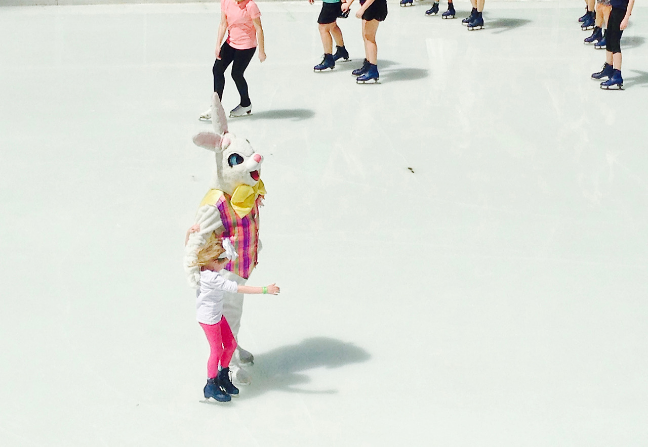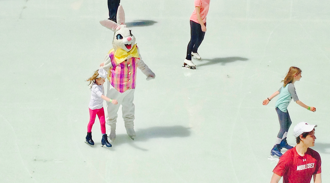 하얀 빙상에서 토끼 의상을 입은 뉴요커가 스케이트를 타고