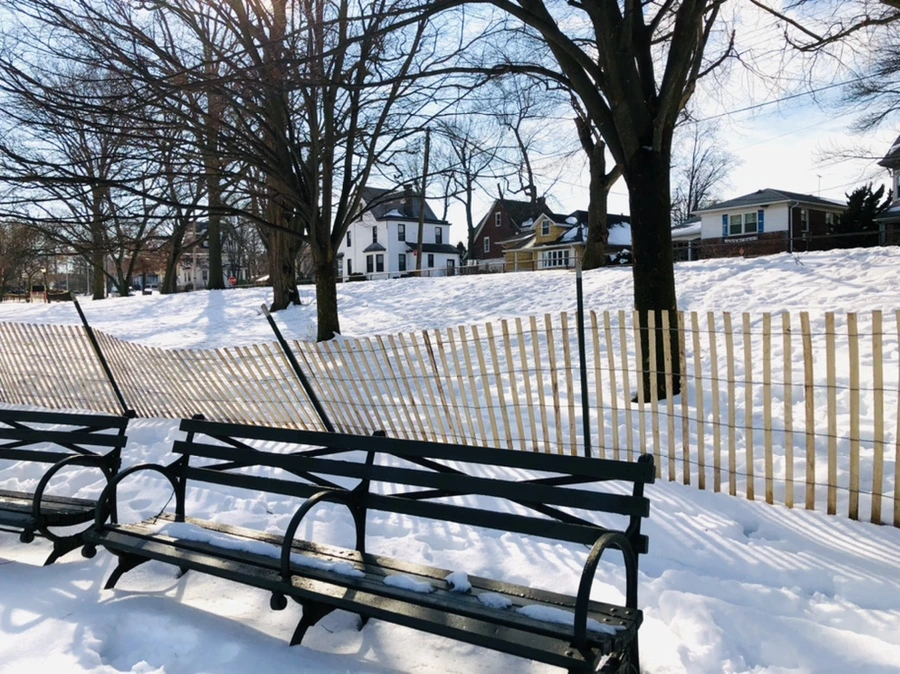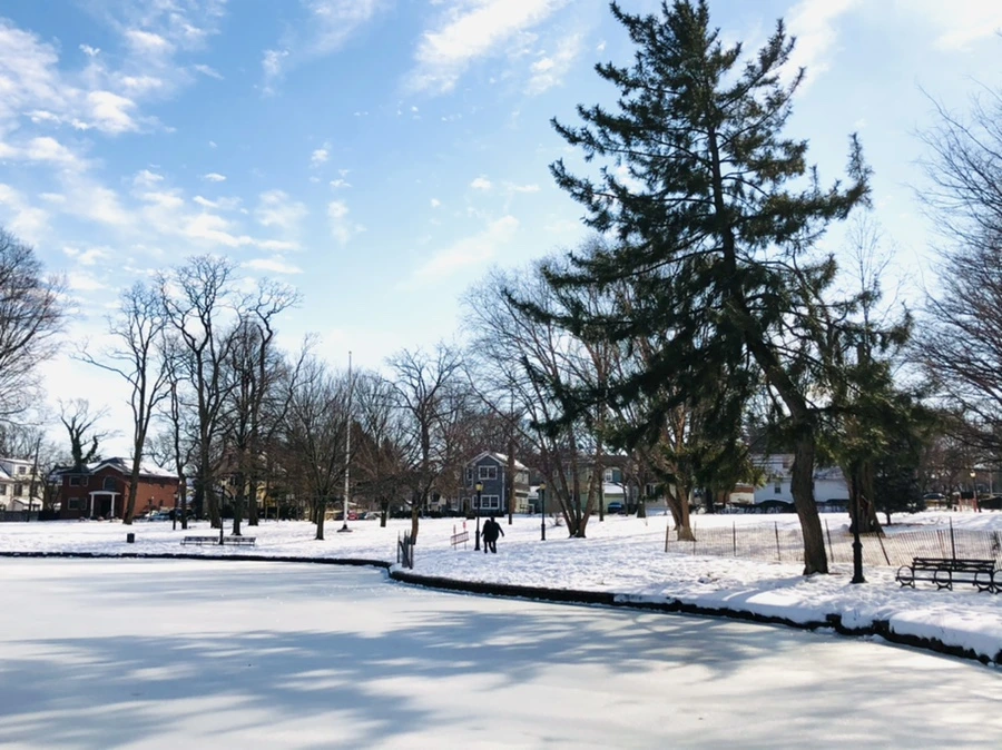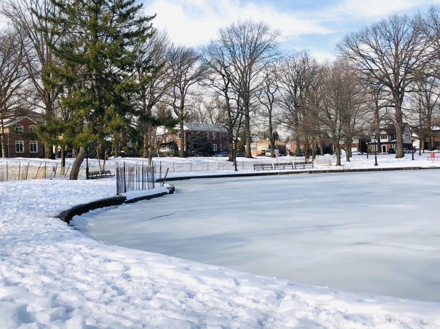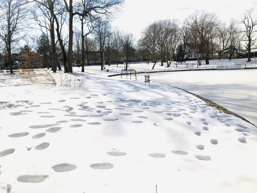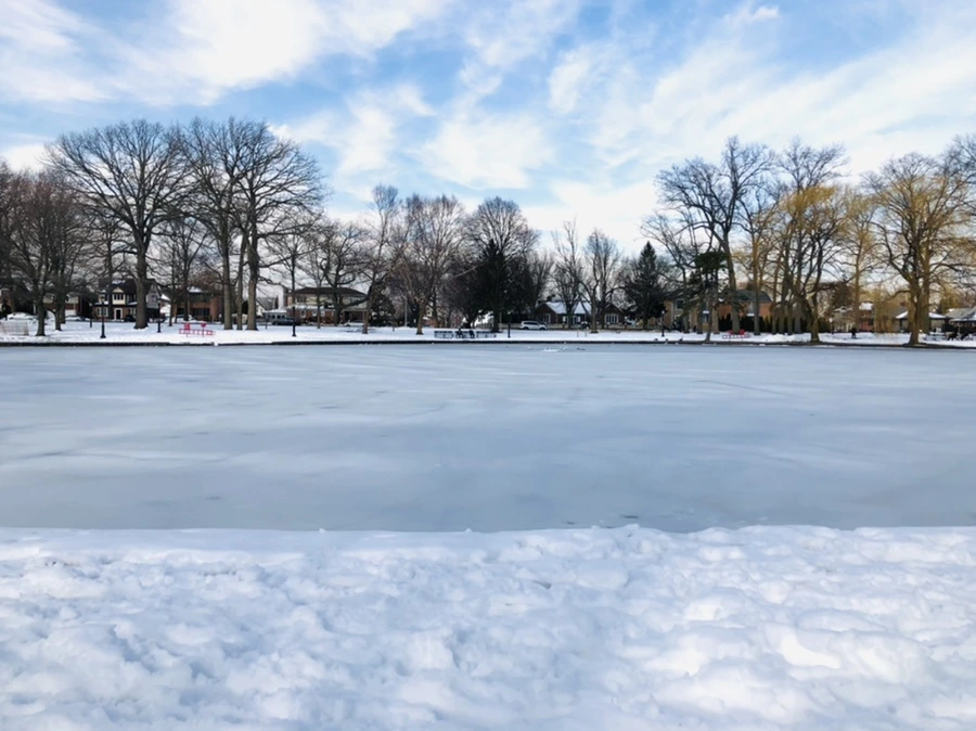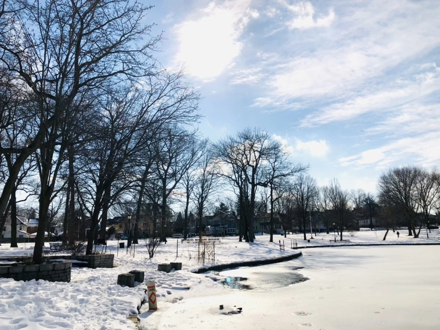 숲과 얼어붙은 호수 사이에