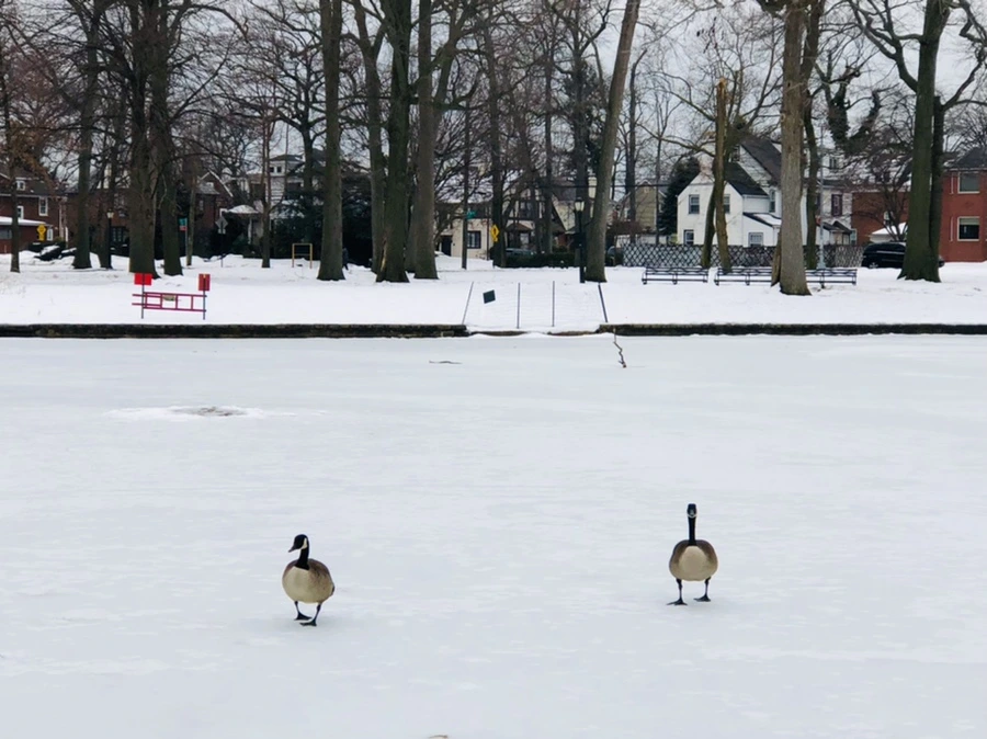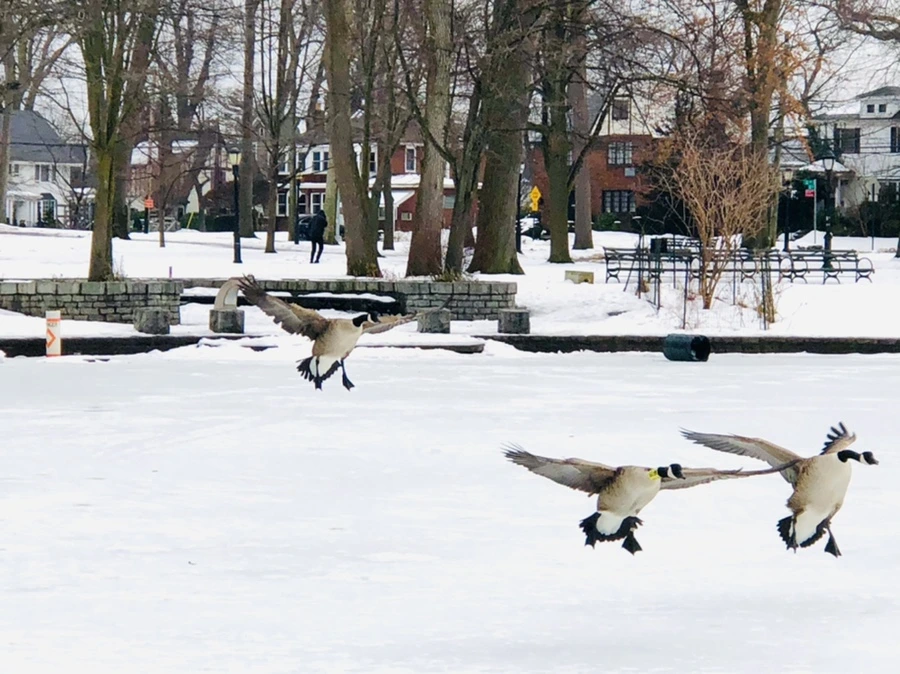 먹이 달라고 멀리서 호수로 날아오는 기러기들