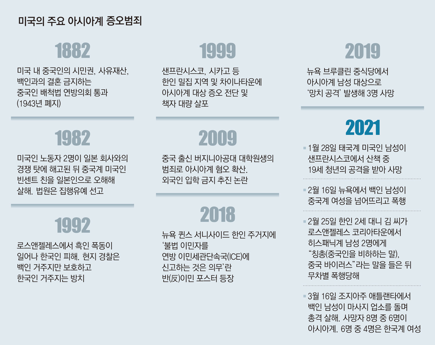 지난해 미국에서는 아시아계를 노린 증오범죄가 급증했다. 비영리단체 ‘증오 및 극단주의 연구센터’는 지난해 미 16개 대도시의 전체 증오범죄가 2019년보다 7% 감소했지만 아시아계를 겨냥한 증오범죄는 무려 149% 증가했다고 집계했다.