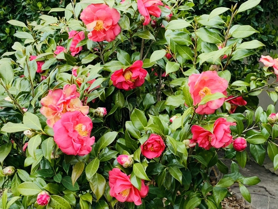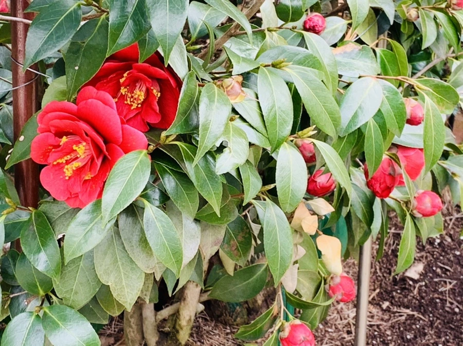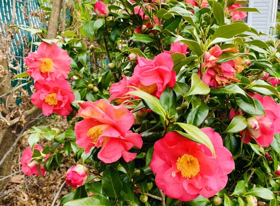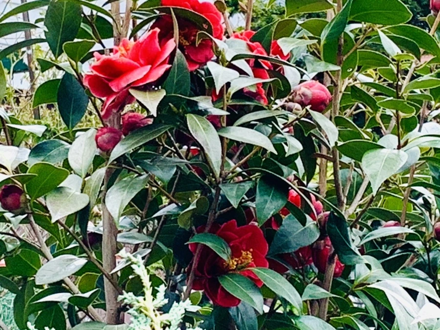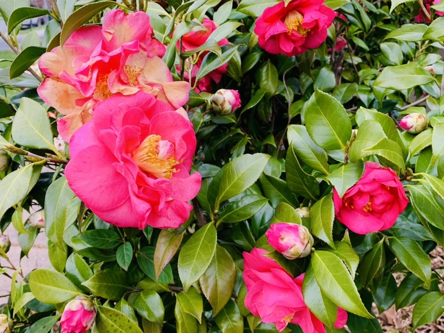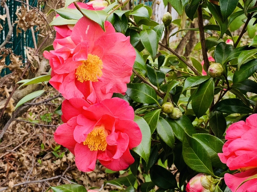 산책하며 휴대폰 렌즈에 붉은 동백꽃 담으며