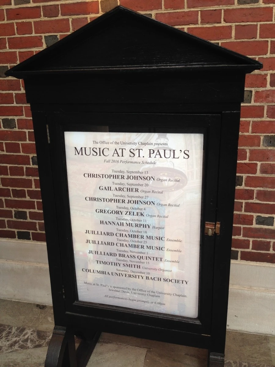 콜럼비아 대학 도서관 뒤편 세인트 폴 교회가 있고 가끔 무료 공연이 열린다. 줄리어드 앙상블을 비롯 다양한 공연을 감상할 수 있다. 화요일 저녁 6시에 주로 열린다.