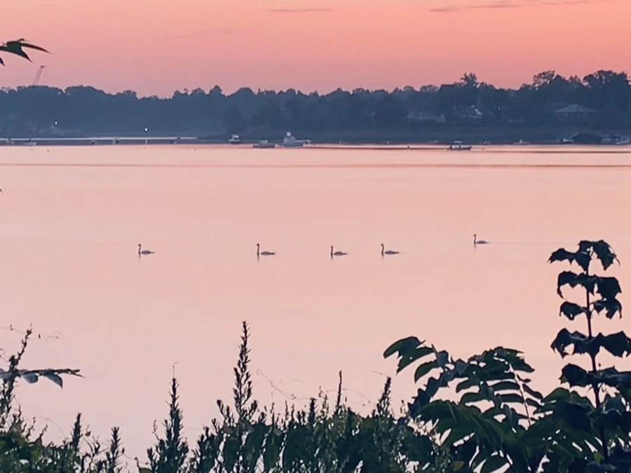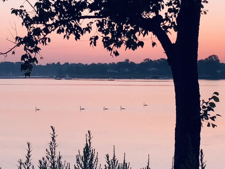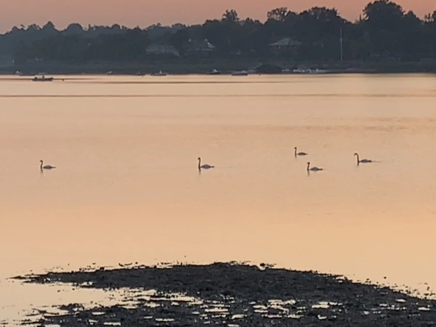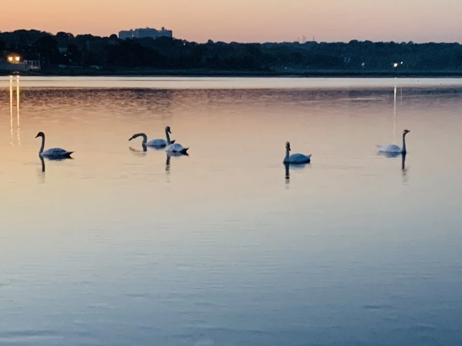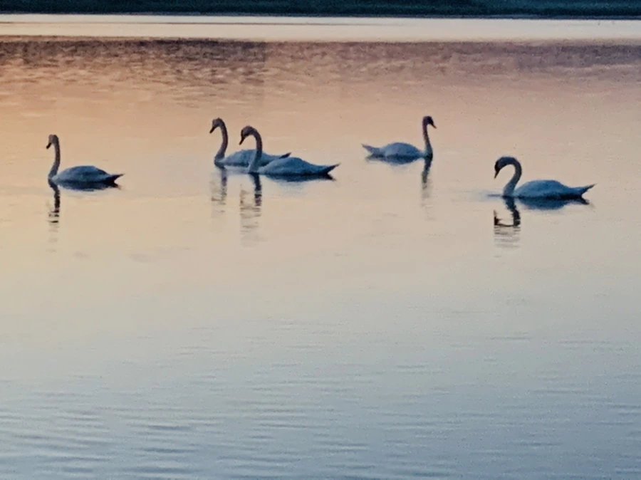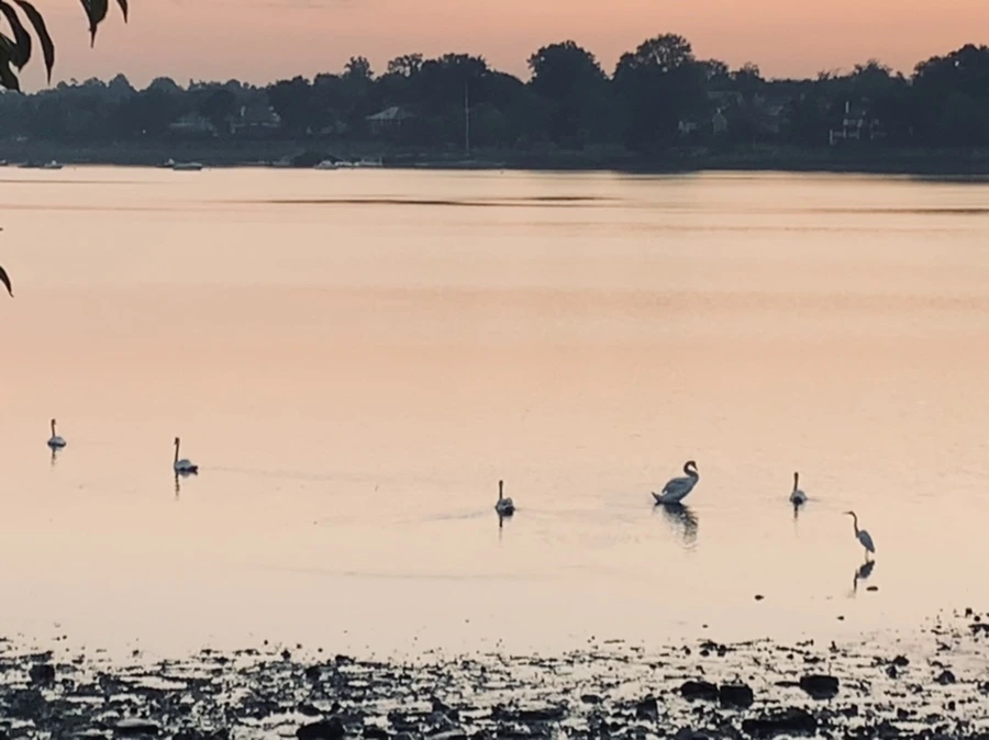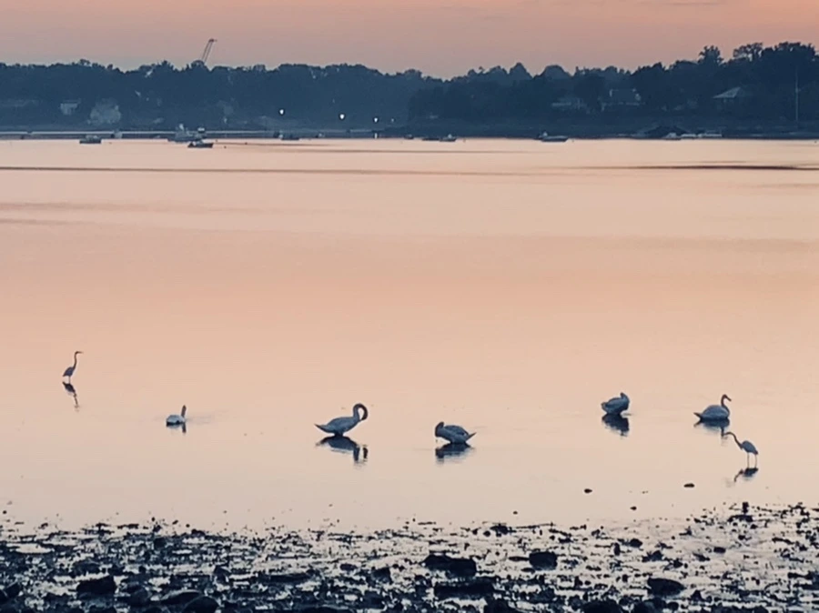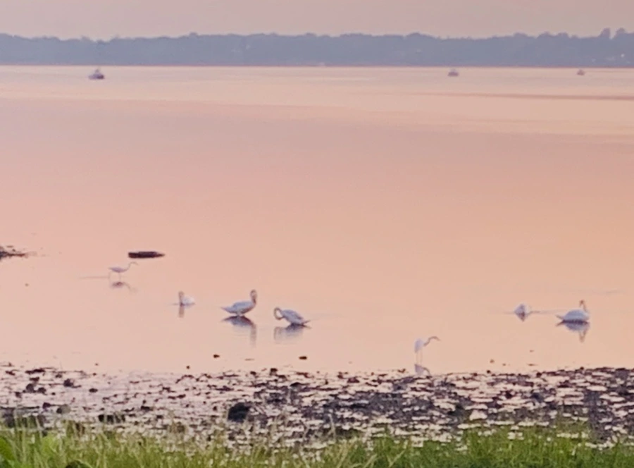 백로와 백조가 산책하는 바다를 보니 신선이 된 듯 착각을 한다.