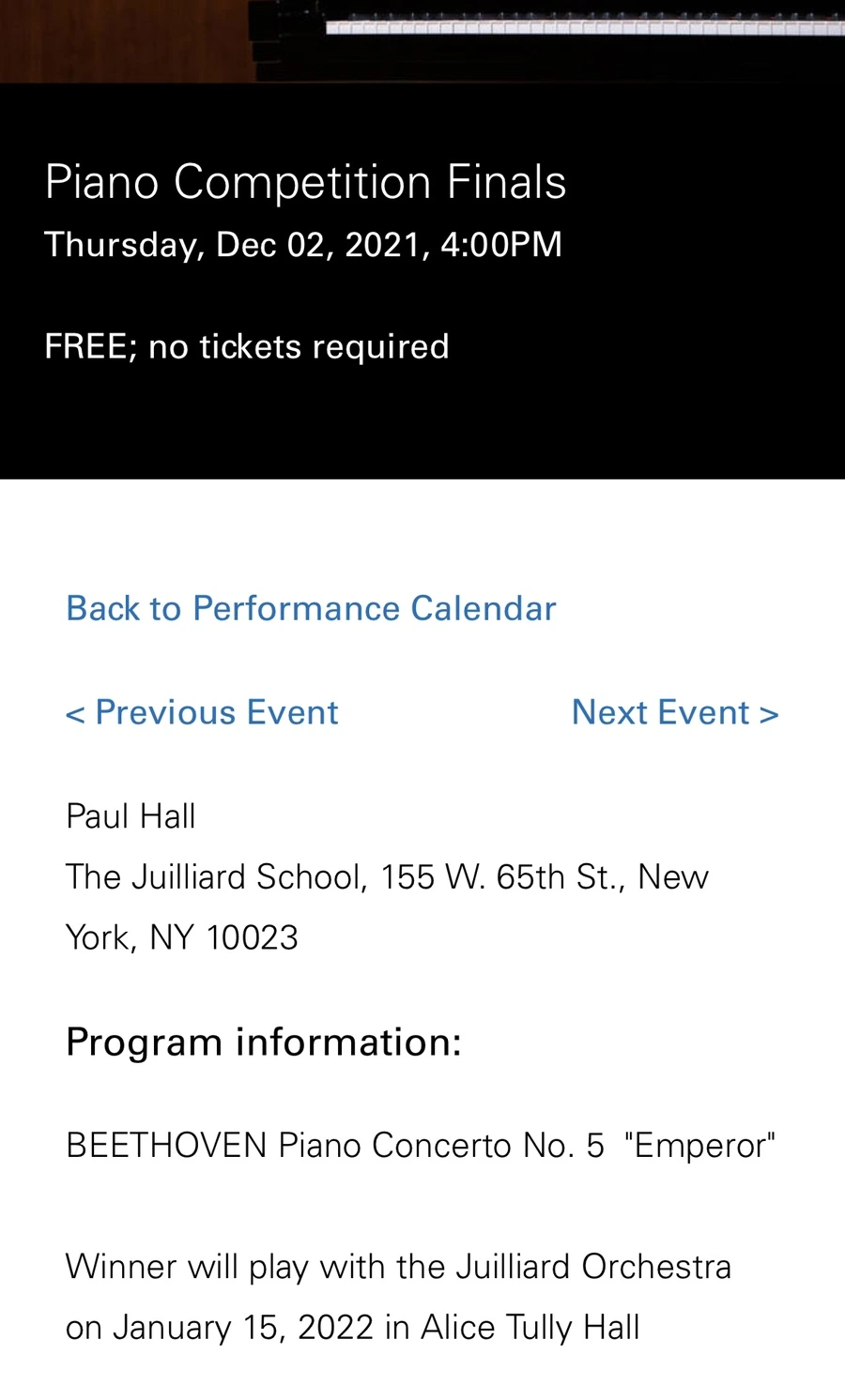 줄리아드 학교에서 피아노 결승 대회가 열려 음악을 사랑하는 팬들에게는 아름다운 음악과 더불어 행복한 시간이다. 유료도 아니고 무료. 얼마나 좋아. 공연 티켓도 미리 예약도 필요 없다. 매년 열리는 대회이고 일반인에게 오픈한다. 작년 코로나로 중지되었다 다시 대회를 볼 수 있어 좋았다.