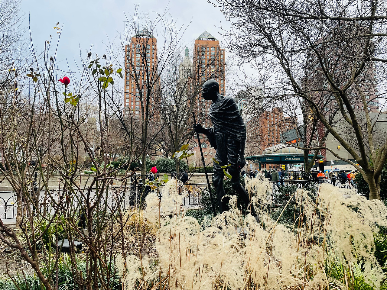 월요일 오후 하얀 눈이 내린다는 일기 예보. 창밖을 바라보니 눈이 내리지 않았다. 분명 어디선가 눈이 내릴 텐데 왜 유니온 스퀘어는 내리지 않았을까. 멍하니 창밖을 바라보다 여행 잡지를 읽은 후 몇몇 책을 펴고 읽다 서점 밖으로 나왔다. 유니온 스퀘어 파크 간디 동상 옆에는 붉은 장미가 피어 있었다.