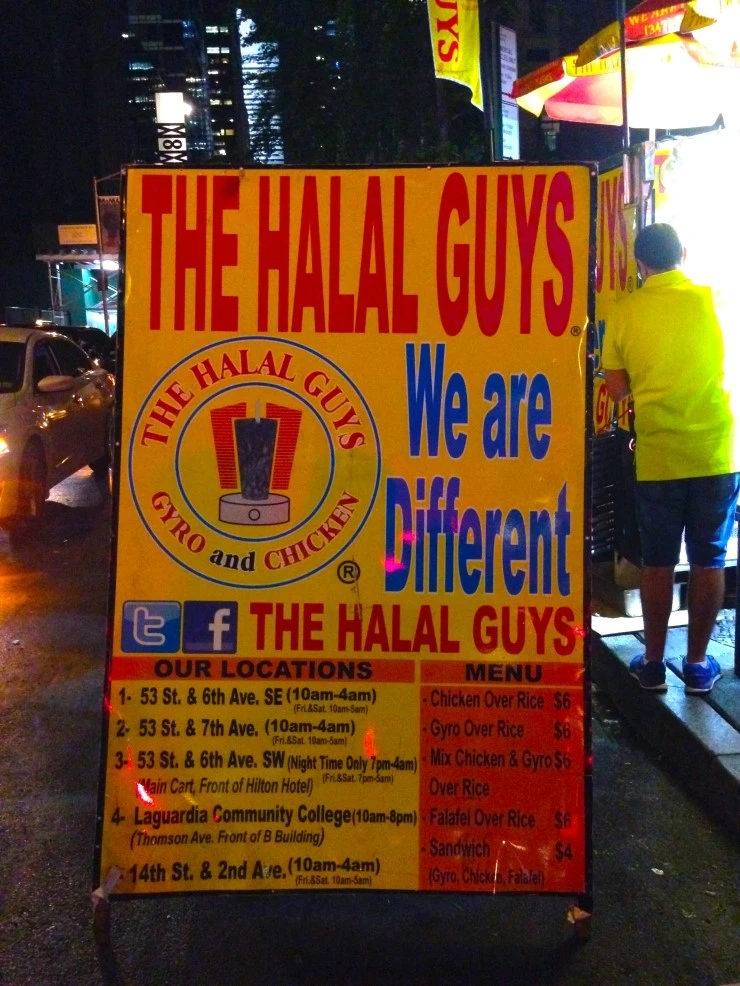 맨해튼은 팁과 세금이 비싸 식사비가 부담스러워 거리에서 음식을 사 먹기도 하고 푸드 트럭이 잘 발달되어 있다. 대표적인 음식 가운데 하나가 '할랄 가이즈'와 '네이산즈 핫도그' 등이 있고 성공한 한식 푸드 트럭 '코릴라'도 있다. 많은 직장인과 학생과 여행객이 이용하는 할랄 가이즈는 뉴욕 명물로 자리 잡고 있다. 과거 1인분에 6불이었으나 차츰 물가가 올라 1인분에 9불 하니 아주 저렴하지 않으나 역시 다른 음식값에 비해 저렴하다고 말할 수 있다.