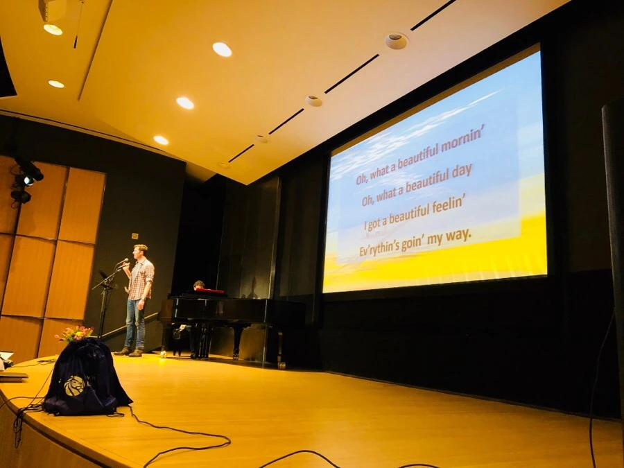 무대에서 뮤지컬 가수가 노래를 부르고