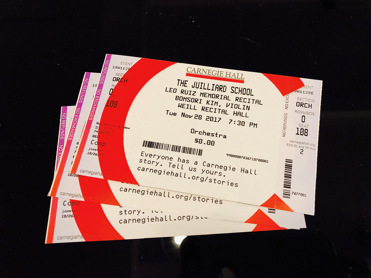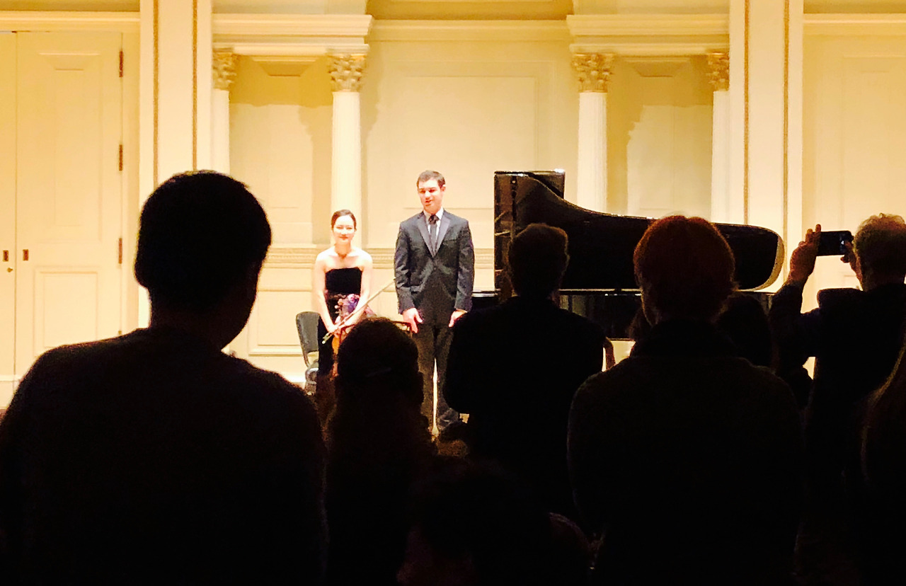 11월 28일 저녁 7시 반 카네기 홀 웨일 리사이틀 홀에서 줄리어드 학교에서 아티스트 디플로마 과정을 밟는 김봄소리 공연이 열려 아들과 함께 갔다. 줄리어드 학교 교수님과 한인 학생들이 많이 찾아왔고 우린 아들 친구가 준 공연표를 주고 입장을 했고 예일대 대학원에서 공부 중인 아들 친구는 너무 바빠서 뉴욕에 올 수 없어서 우리만 공연을 봤다. 오늘 저녁 공연은 무료였으나 표를 구하지 못해 공연을 볼 수 없는 사람도 많았다. 웨일 리사이틀 홀은 규모가 작고 아담한 홀이다. 지난번 줄리어드 학교에서 바이올린 파이널 대회에서 김봄소리 브람스 바이올린 협주곡으로 우승을 했고 그 후 줄리어드 학교 오케스트라와 공연을 했고 그 후 카네기 홀에서 공연을 했다. 검은색 드레스를 입고 무대에 오른 김 봄소리. 피아니스트도 줄리어드 학교에서 아티스트 디플로마 과정을 밟고 5세 카네기 홀 웨일 리사이틀 홀에서 데뷔한 천재 피아니스트. 봄소리 가브리엘 포레와 생상 곡 연주가 아름다웠다. 앙코르 곡으로 타이스의 명상곡을 연주했다. 가을밤 아름다운 바이올린 소리에 황홀했다.