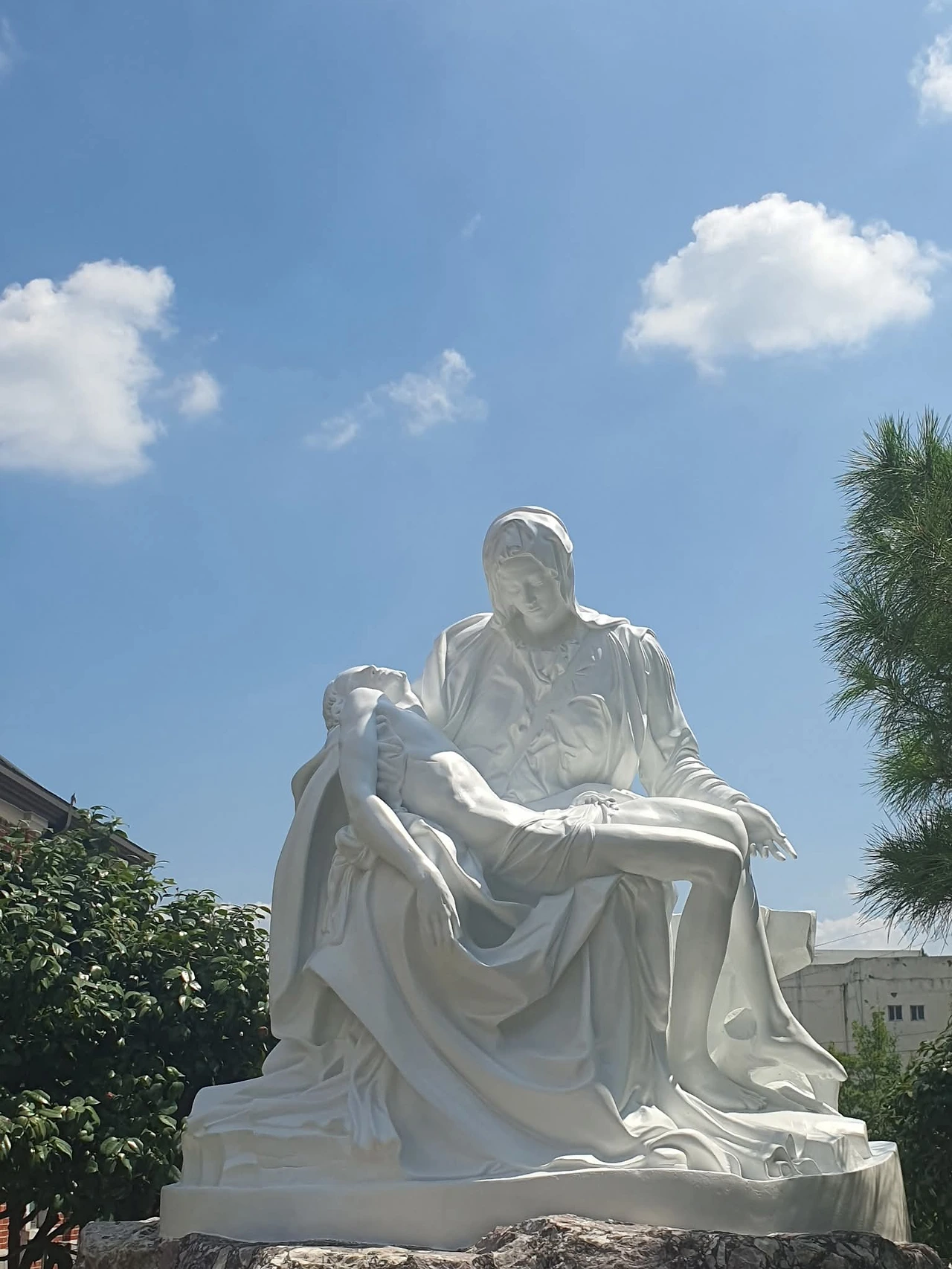 첫날 기도를 마치고 성당 주변을 걸었습니다. 뜨거운 태양이 정수리를 아프게 쏘았고, 저는 양산을 쓰고 걸었습니다. 그때 제 눈에 들어온 것은 강렬한 햇빛을 받으며 빛나던 하얀 피에타상이었습니다. 제게 말로 표현하기 어려운 울림을 주었습니다. 태양과 조각상이 만들어내는 빛의 조화가 제 마음을 흔들었습니다. 저는 다시 한 바퀴를 돌다가 피에타상의 빛을 사진으로 담고 싶었습니다.