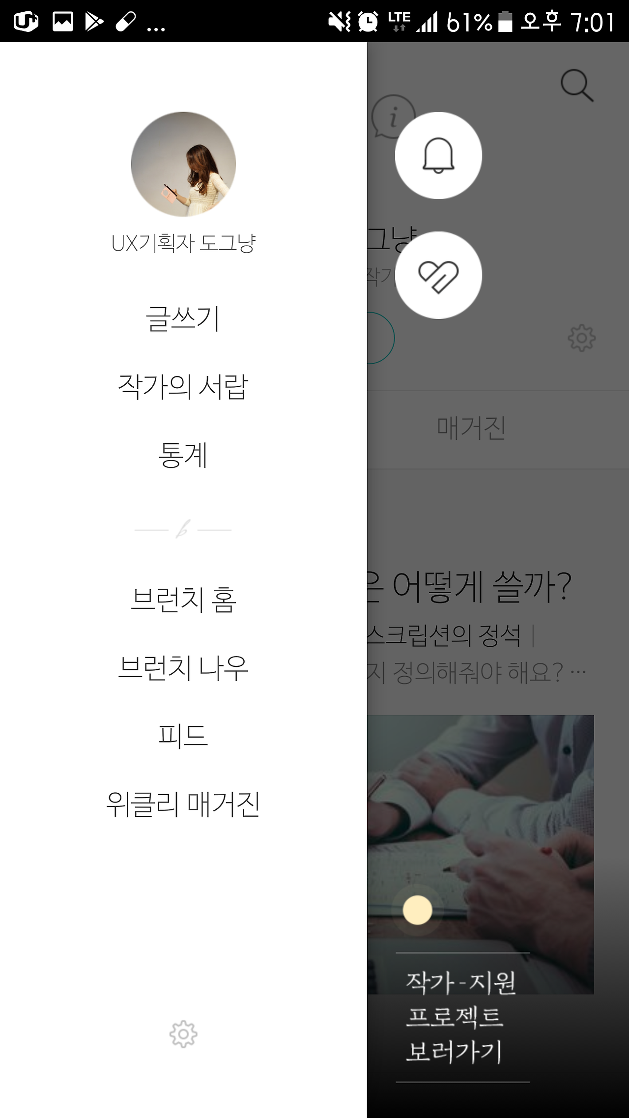 1) 브런치 앱이 실행된 상태에서 햄버거 메뉴를 연다