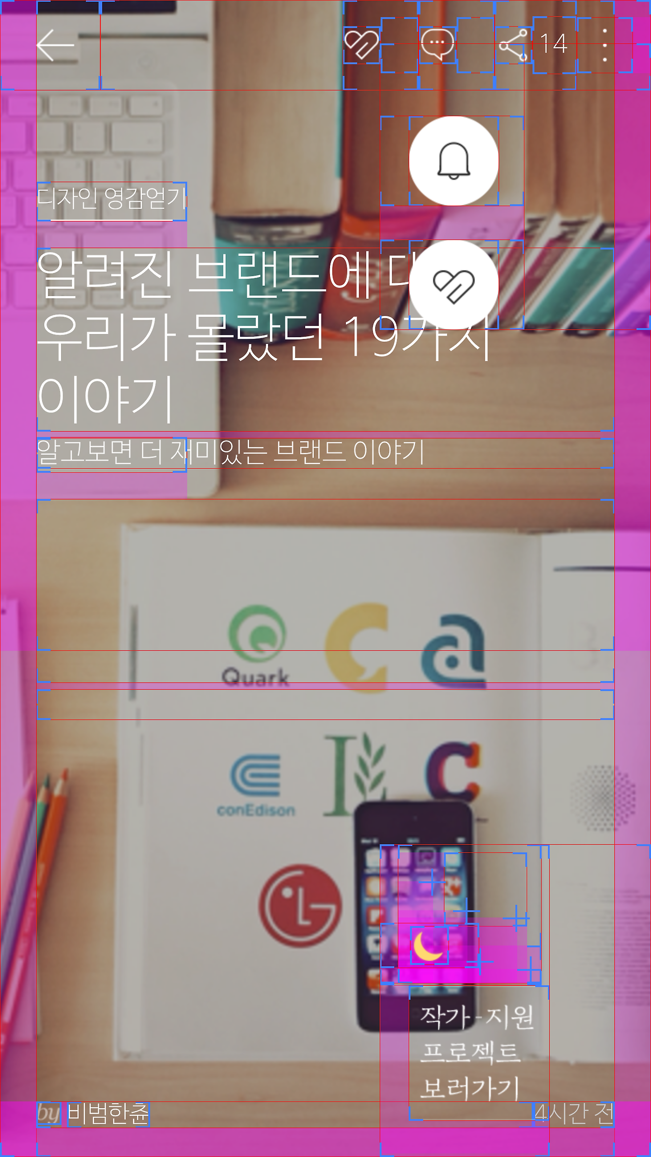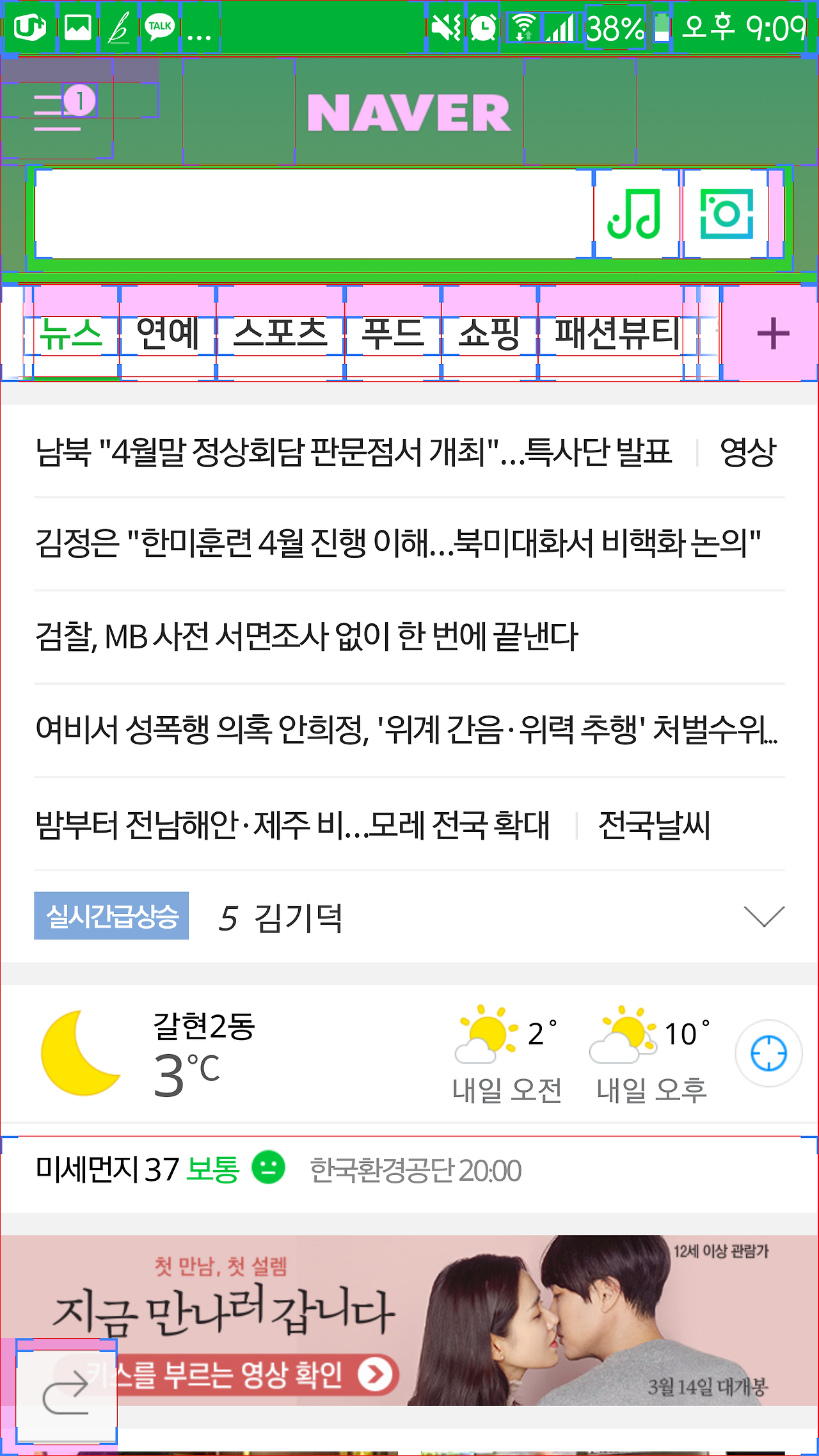 이 메뉴를 이용하면 웹과 네이티브 영역의 구분이 가능한데, 웹과 앱의 특징을 볼 수 있다. 밑은 이미지는 안드로이드의 네이버앱의 레이아웃 표시된 영역이다. 하단의 부분은 레이아웃이 표시되지 않고 한 면으로 되어 있는 것을 알 수 있다.