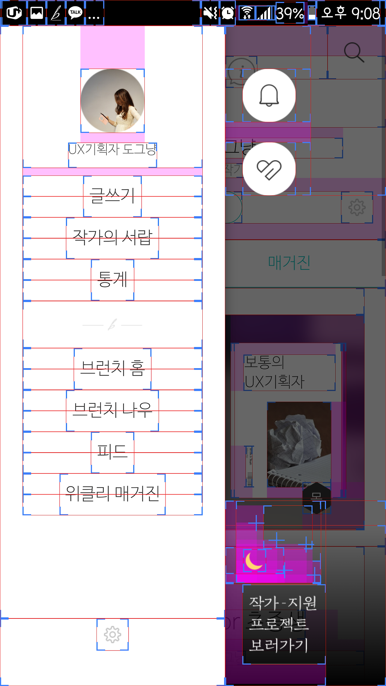 브런치의 앱이 바닥페이지의 컨텐츠면과 햄버거메뉴와 플로팅 영역으로 분리되어 구성되어 있었는데, 딱 이 케이스에서 바닥페이지가 이동할 때 햄버거메뉴만 닫히고 무슨 이유에서인지 플로팅 영역은 닫히는 것이 작동되지 않았던 것이다.