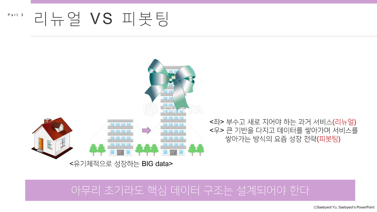 요즘은 그래서 오른쪽처럼 애초에 고층건물 쌓을 수 있는 기반을 만들어놓고 계속 서비스를 확대하거나 변화시킵니다. 여기서 기반은 인프라가 아니에요. 바로 데이터죠.