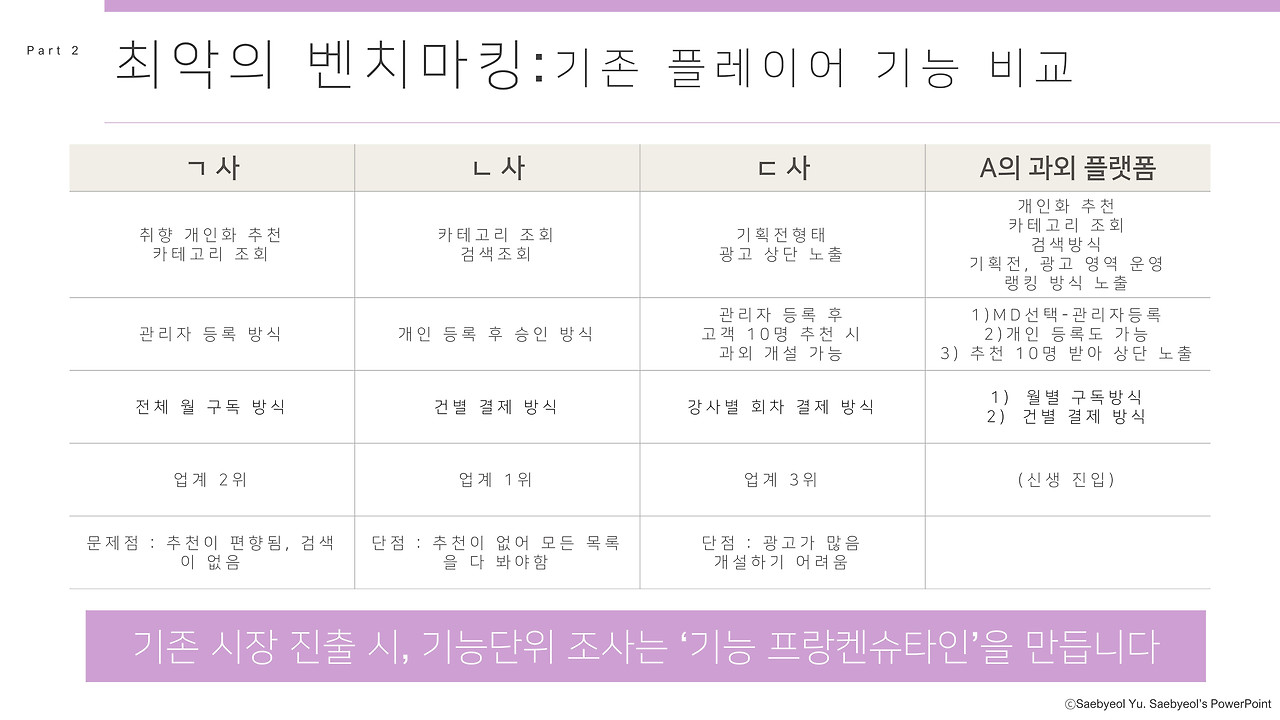 앞서 나온 A님의 신사업에 대해서 계속 이야기해볼께요. 해당 시장의 가상의 ㄱ사, ㄴ사, ㄷ사가 있었다고 치고 A님이 조사를 했다고 해보시죠. 각자 서비스는 아롱이 다롱이죠. 비슷하지만 좋아보이는 것들이 달라요.