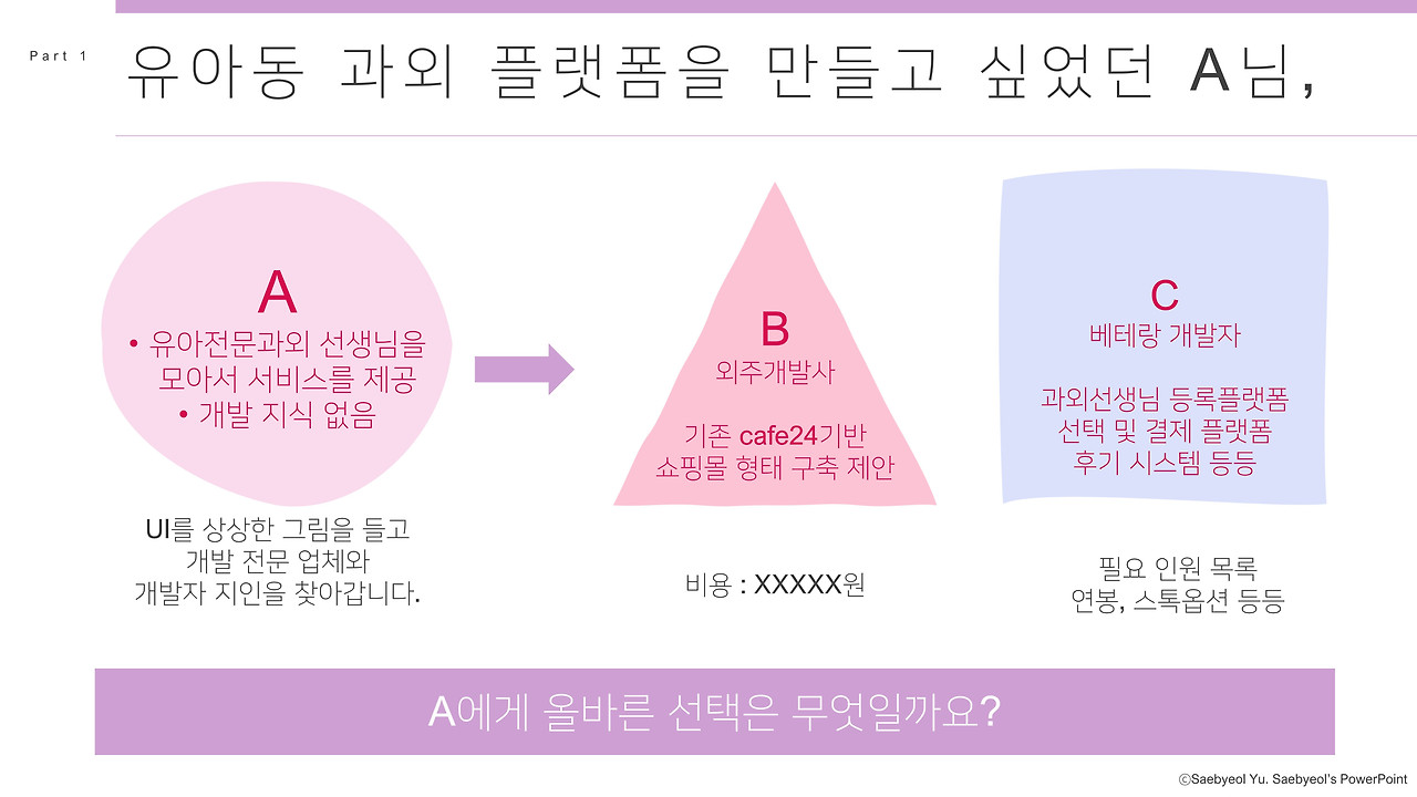 외주개발사를 운영하는 B는 전달한 내용을 보고 카페24기반의 사이트 구축에 필요한 비용을 알려주고 포기해야할 것들을 짚어줬고요. 경험이 많은 개발자 C는 전체 구축에 필요한 기능들을 개발하기위해 필요한 인원수에 대해서 말하고 조인할 경우의 연봉과 스톡옵션을 이야기했다고 해요.