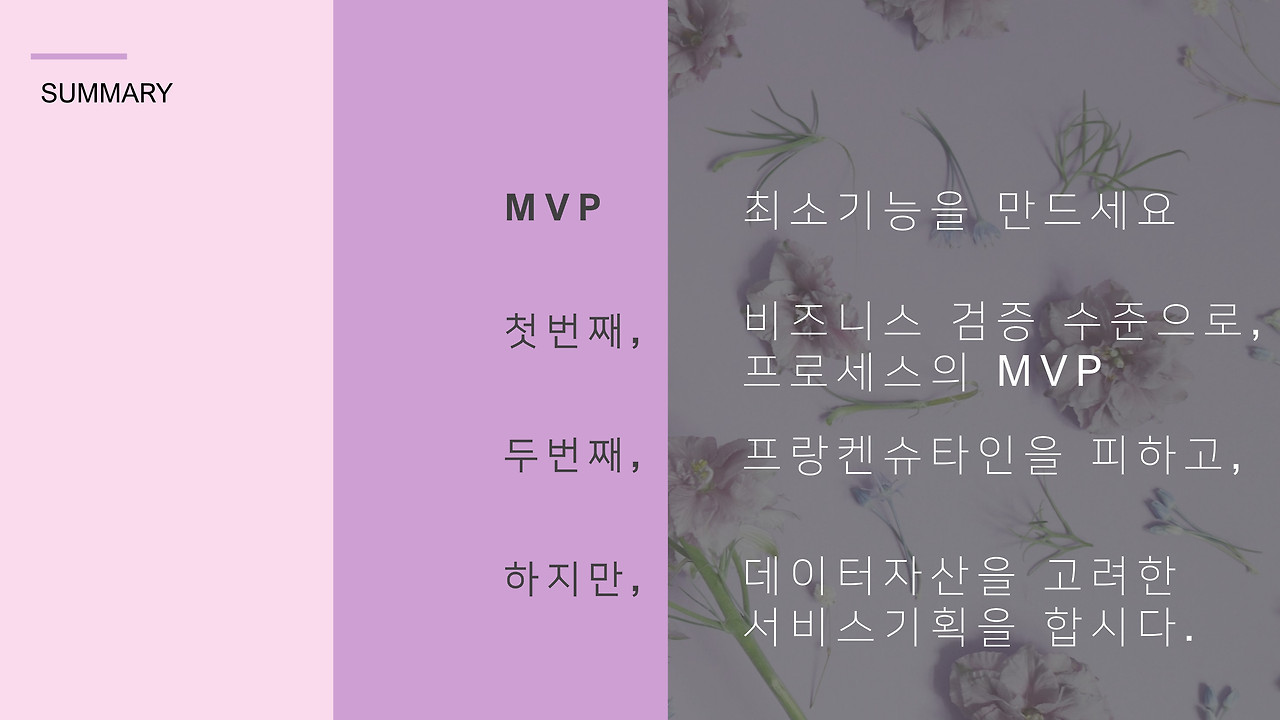 신규서비스를 만드실 때는 구현 전에 비즈니스 검증 수준의 MVP를 설정하고 첫 런칭품은 POC라고 생각하세요. 그리고 기존 시장에 진입할 때는 기능 프랑케슈타인을 피하고 본인 서비스에 맞게 취사선택하고 마지막으로 데이터자산을 고려한 서비스기획을 해야한다는 이야기였습니다.