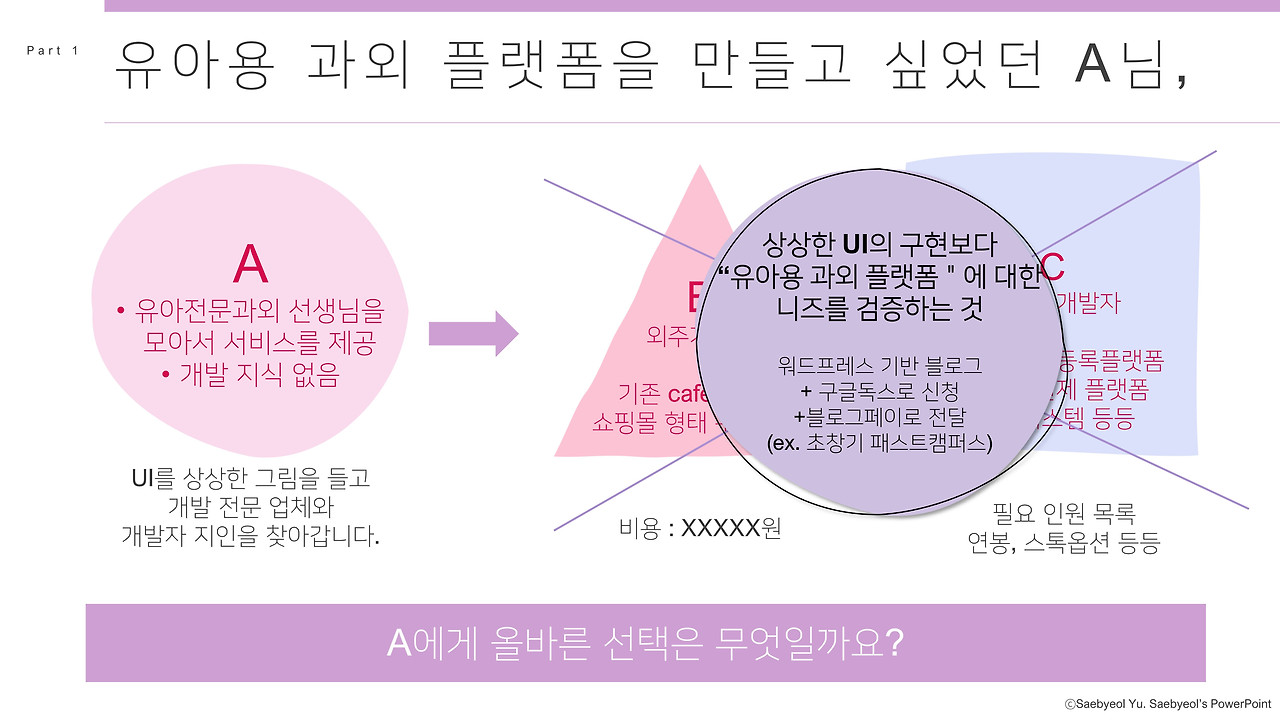 사업이 얼마나 시장성이 있는지 모르는 상태에서 어떤 방식으로도 최종적인 형태로 구축할 하는 것은 비용리스크가 커지죠. 엔젤투자비용을 전부 개발에 투자해야할 수도 있었죠.