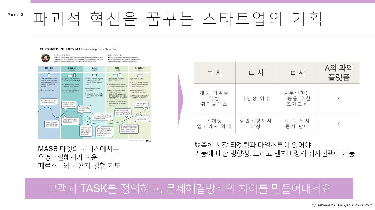 파괴적혁신을 위해서는 고객의 TASK와 적절한 우리만의 문제해결방법을 정해서 벤치마킹된 내용에서 취사선택할 수 있어야겠죠. 물론 앞으로의 방향성과 비전이 이러한 선택에 기반이 되어야할 것 같고요.
