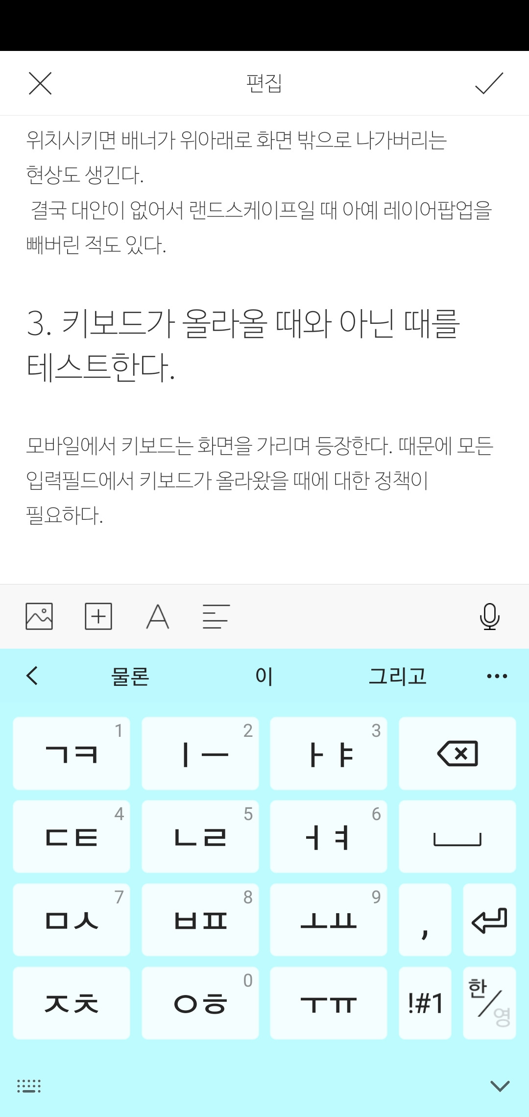 자칫하면 입력창이 중첩되어 쓸 곳이 없어져서 문장도 하나 안보이게 될 수도 있다. 이 부분은 포트레이트와 랜드스케이프도 고려해야한다.
