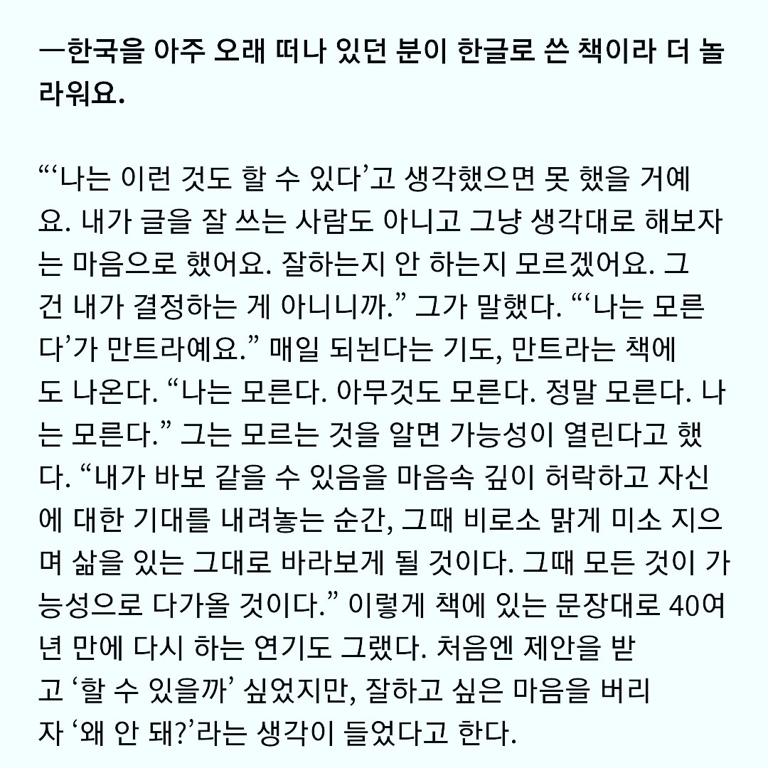 오늘 어쩌다 배우 문숙님의 인터뷰를 봤다. '나는 모른다'가 만트라라고 한다. 만트라는 중얼중얼 되뇌이며 영혼에 영향을 주는 진언이다.