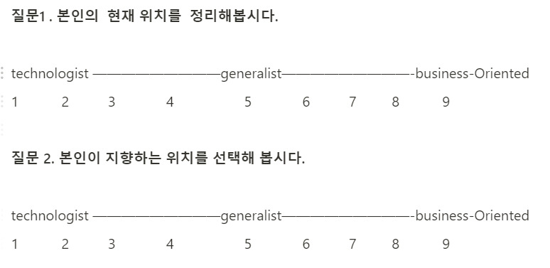 감사하게도 사내에 다양한 배경의 사람들이 있어서 내가 공부한 부분에 대해서 상의해볼 수 있었다. 스타트업 출신들부터 쿠팡, 네이버, 카카오, 이베이, 11번가 등등 다양한 배경의 PM들이 섞여 있었고 각자의 장단점과 담당하는 프로덕트가 굉장히 달랐기 때문에 내가 생각하는 유형에 대해서도 각자의 위치와 목표를 생각해볼 수 있었다. 그리고 이런 고민을 바탕으로 자신의 유형을 고민해볼 수 있는 테스트 질문 리스트를 뽑아볼 수 있었다.