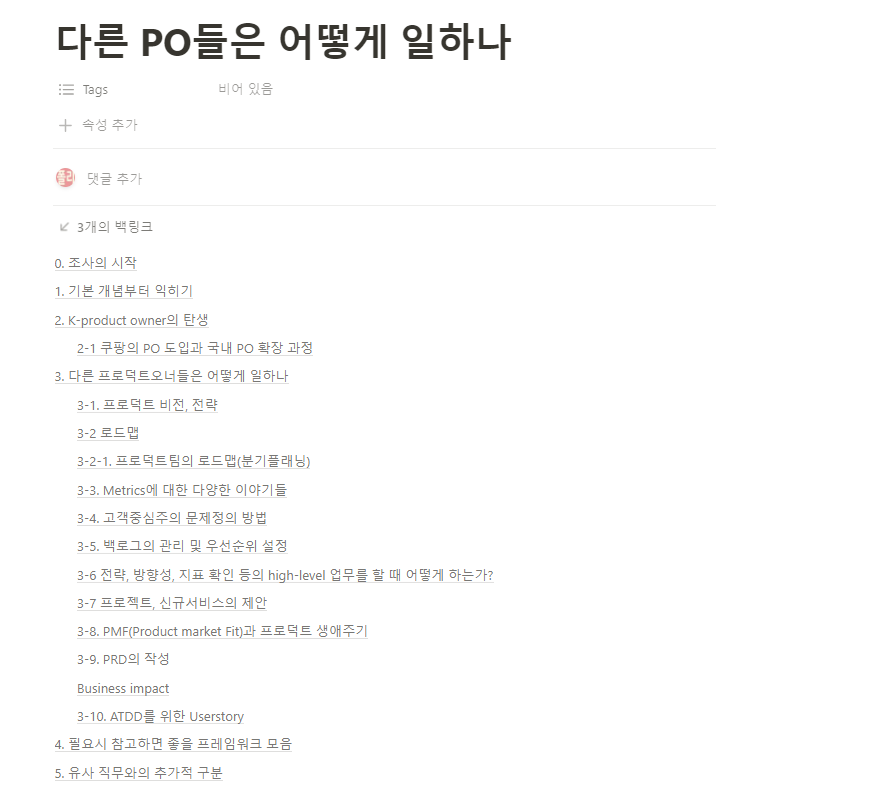 그런 의미로 2022년 3월부터 정리한 '다른 PO들은 어떻게 일하나'라는 나의 학습 자료는 나에게는 중요한 기본기를 채워주고 내가 해야하는 일을 정리하는 중요한 작업이었다. 해외 유튜브 채널의 웹비나나 관련 아티클들도 엄청나게 보면서 키워드를 외우는 것이 아니라 이해하려고 노력했다.