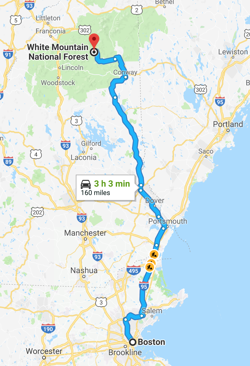 당시 하숙집에서 알게 된 박사님이 여기를 다녀오신다고 하길래, 동행을 부탁드려 따라갔다. 다양한 사람을 만날 수 있는 하숙집의 장점이다. 그때에는 옆동네에 단풍이 예쁘게 들었으니 놀러 갔다 와 볼까? 하고 가볍게 출발했었지만, 보스턴에서 화이트 마운틴까지의 거리는 170 miles, 약 290km 정도의 거리다. 한국으로 치면 서울-대구 정도의 거리인데, 당일치기가 불가능한 정도는 아니지만 가볍게 가기에는 꽤 거리가 있었다. 이런 사전 정보를 잘 모르고 덜컥 따라갔더니 분명 옆동네라고 했는데 가도 가도 목적지에 도착하지 않는 것이 아닌가.