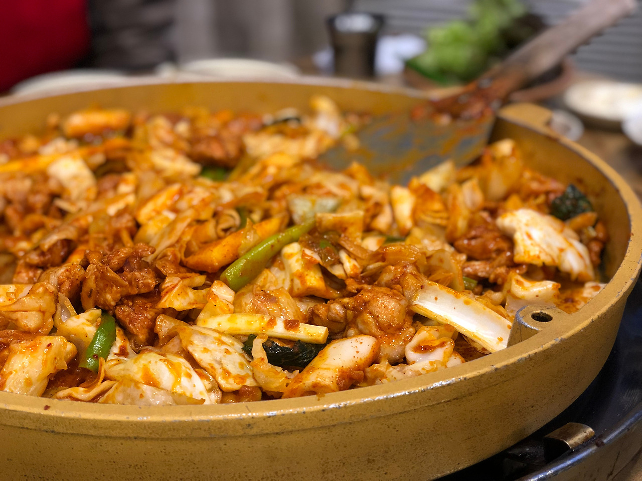 짐을 풀고 잠시 휴식을 취하면서 닭갈비집을 찾았다. 민박에서 가까운 곳 중에서 눈에 들어온 곳이 있었는데, 황금 불판을 사용한다고 했다. 아이들이 먹을 수 있도록 맵지 않은 닭갈비도 있는 것 같아 찾아 나섰다. 민박에서 5분 정도 걸으면 닿는 곳의 가게에 들어서니 자리마다 놓여 있는 황금 불판과 벽 면에 걸려 있는 사인이 눈에 들어온다. 2016년에 2TV 생생정보에 소개된 이 가게의 불판은 순금으로 도금해서 눌어붙지 않고 타지도 않는 특징이 있다고 한다.