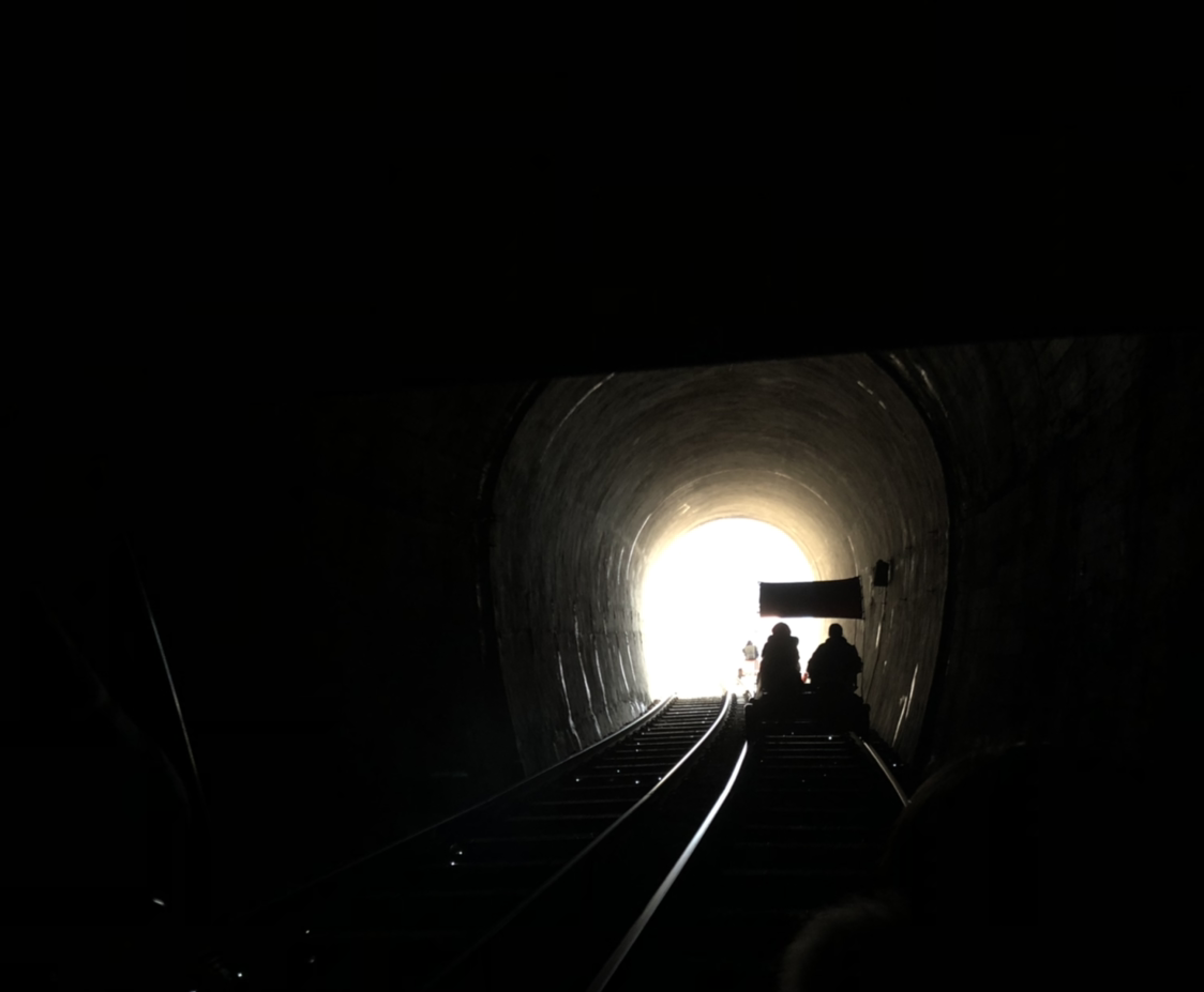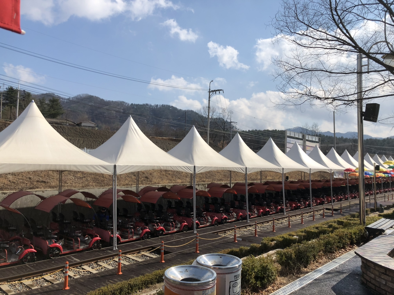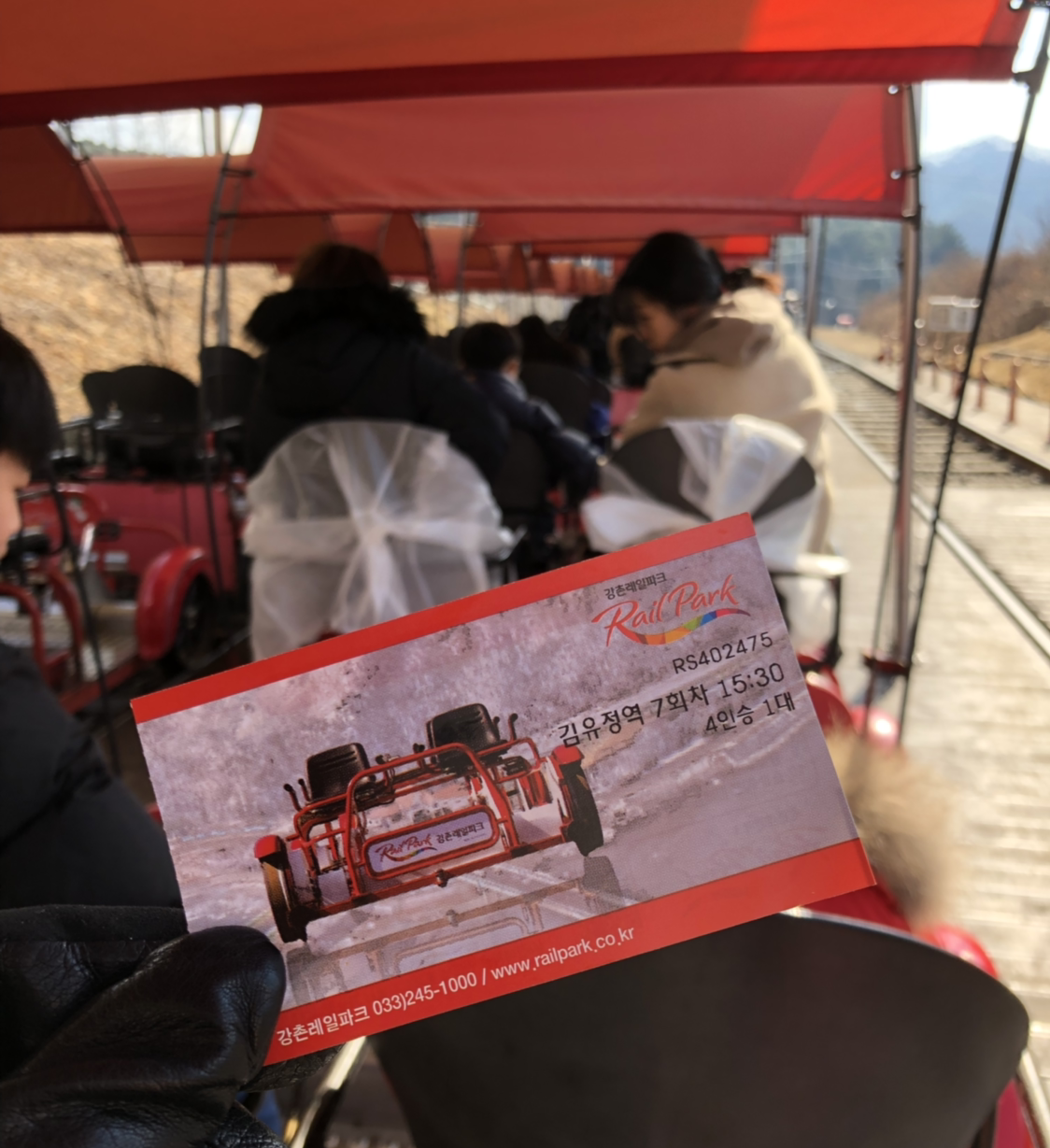 눈은 그쳤다. 레일바이크에는 간단한 지붕이 있었지만 사방에서 들이치는 눈, 비를 막지는 못하는 모양이니 좌석이 젖어 있었다. 파크에서 제공한 우의로 좌석을 덮고 앉으니 옷이 젖을 문제는 다행히 해결이 되었다. 시간이 되니 탑승 방법에 대한 안내가 있었고, 수 십 대의 바이크에 사람들이 올라타기 시작한 후 차례차례 출발한다. 추돌할 경우에는 안전거리를 확보하지 않은 뒤 차에 100% 과실이 있다고 하니, 이 점은 주의해야 한다.