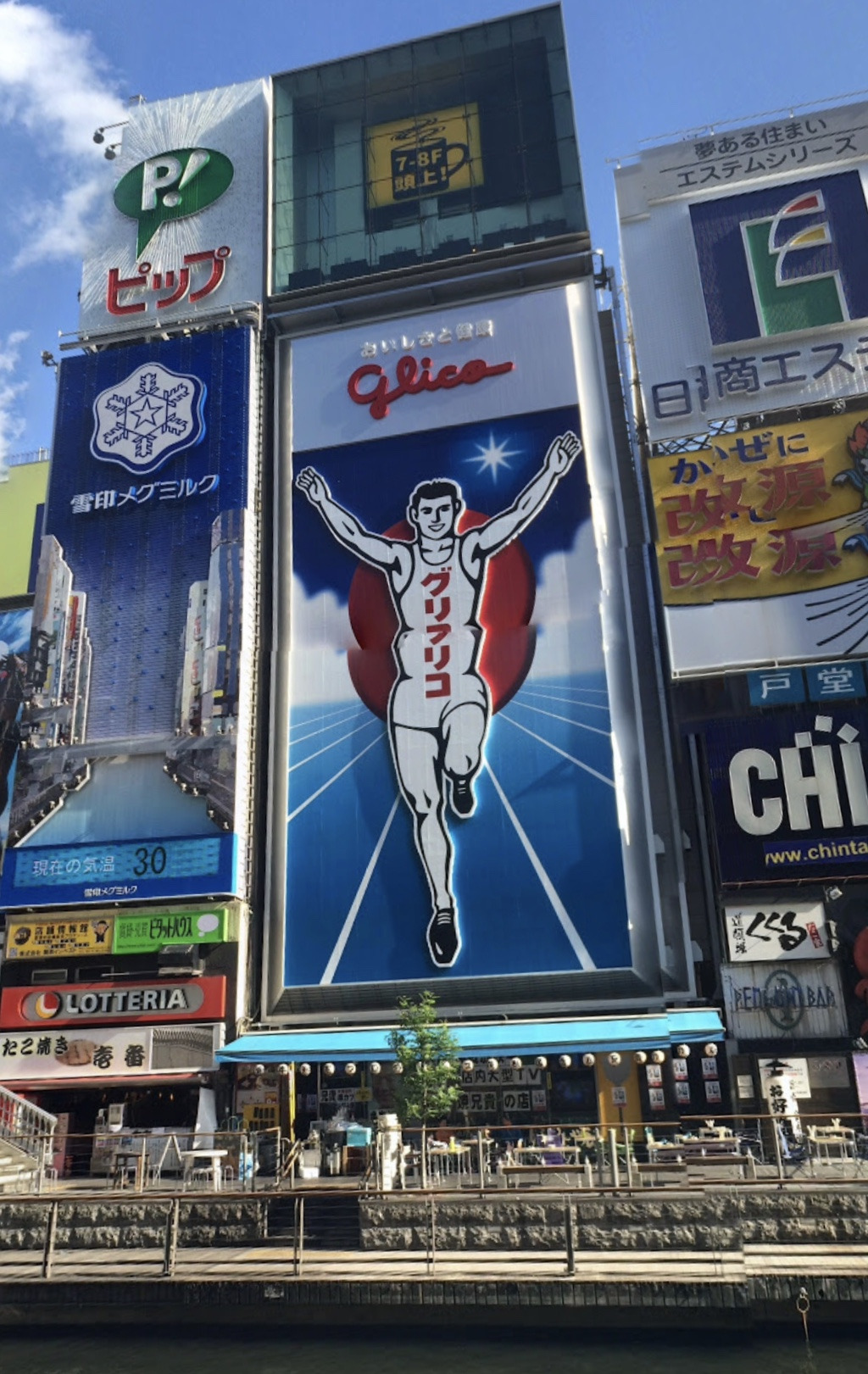답답한 인파가 끝나는 지점에 사람들이 사진을 찍느라 바쁜 곳이 나타난다. 에비스바시(다리)다. 도톤보리에서 유명한 것 중 하나가 에비스바시 가까이에 있는 글리코 사인이다. 제과 회사의 옥외 광고로, 예전 이 회사의 마라톤 선수가 도톤보리에 골인했던 장면이 그려져 있다. 주변의 여러 네온사인과 함께 오사카 방문의 인증숏 촬영 지점이 되어 있다. 남들 하는 건 다 해봐야 한다. 아니, 할 수 있다면 더 해야 된다. 인증숏을 남겨 본다.