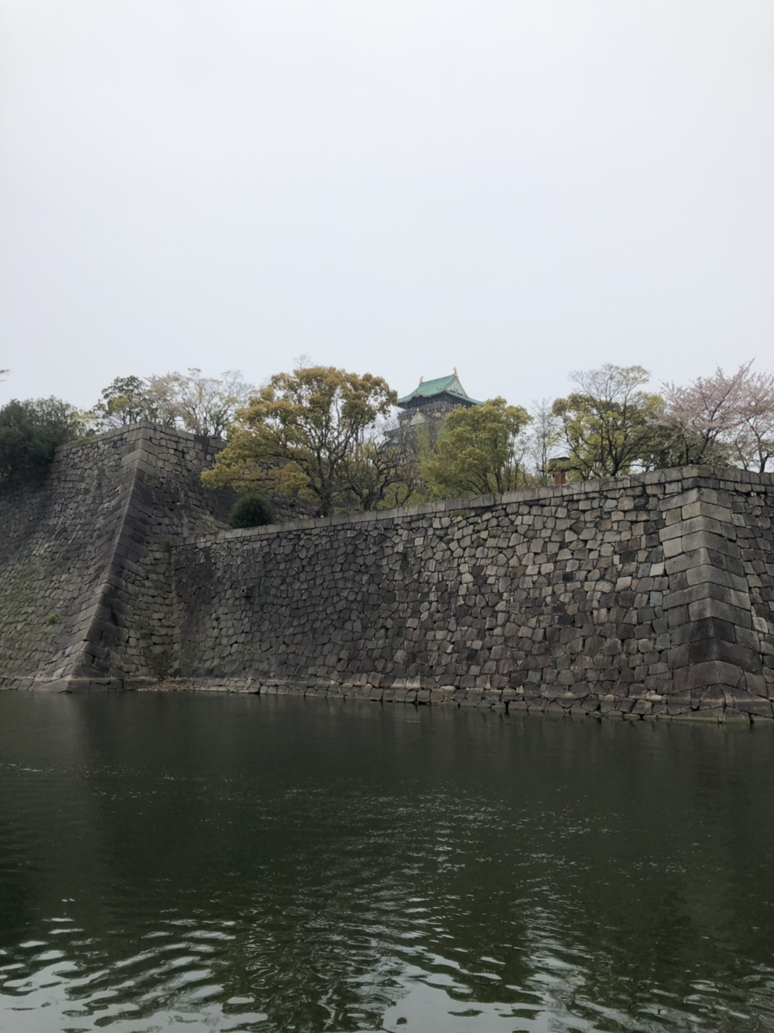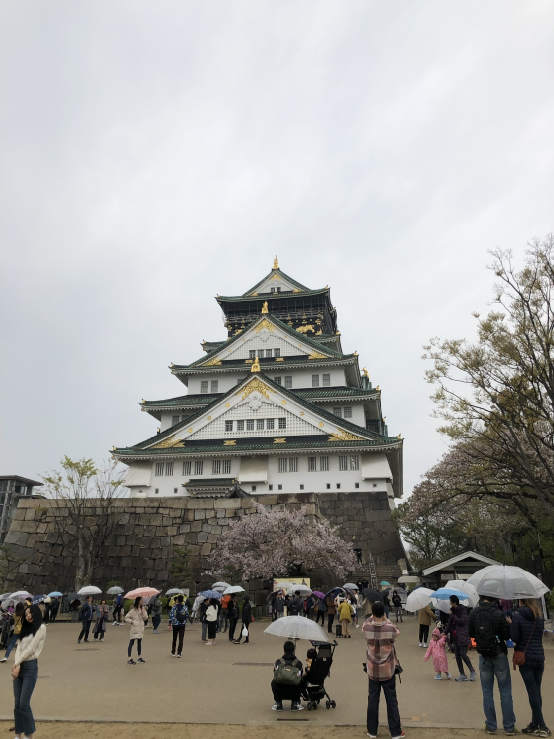 우산을 받쳐 들고 산책을 시작해 본다. 멀리 보이던 성의 상징, 천수각(天守閣)이 점점 가까워진다. 4월 중순이라 벚꽃이 졌으면 어쩌나 걱정을 했는데, 곳곳에 피어 있는 벚꽃에 안심했다. 종류에 따라 꽃이 지고 있는 나무, 만개한 나무가 있었다. ‘어른들이 꽃을 이렇게 좋아하시는구나.’ 걷다가 수시로 멈춰 사진으로 담아 두었다. 꽃 사진, 단체 사진. 배경으로는 오사카성.