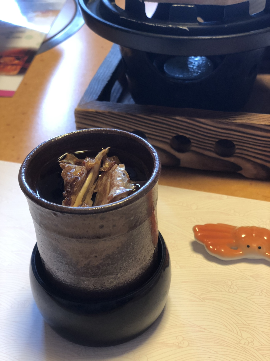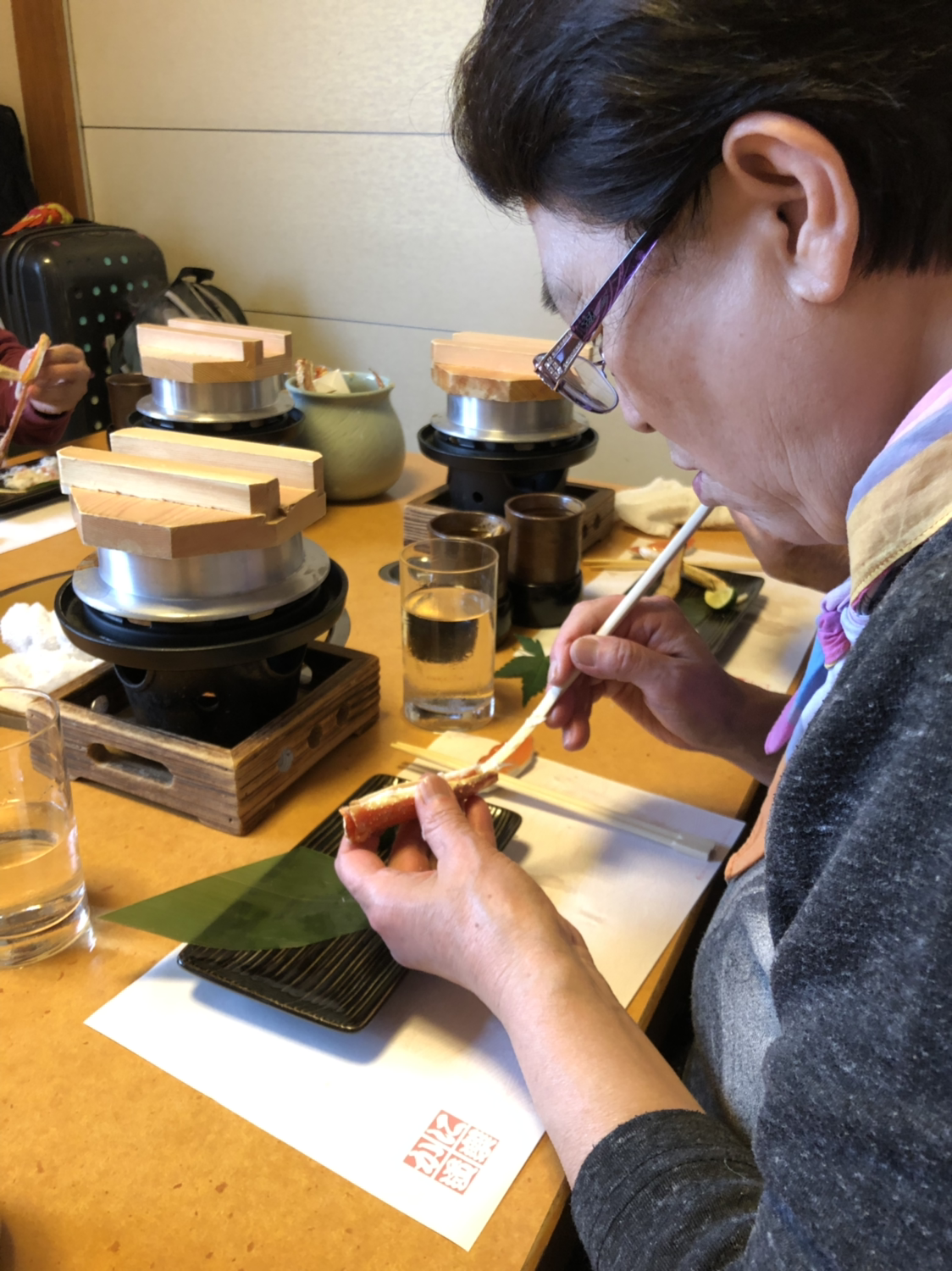 삶은 게, 게 회, 게 계란찜, 게 그라탱, 구운 게, 게 가마솥밥, 그리고 후식으로 말차 아이스크림. 음식이 하나씩 등장할 때마다 아기자기한 모양에 감탄하고, 한 입 먹을 때마다 처음 먹어보는 맛에 감탄했다. 음식이 나오기 전에 따뜻한 니혼슈(정종)를 한 잔 씩 시켰다. 비를 맞고 와서 따뜻한 술 한 잔 생각이 나기도 했지만, 이 집에서 맛보아야 하는 게술(카니자케, 800엔/잔)을 마셔 봐야 했다. 구운 게 껍데기를 넣어 향을 음미하면서 마신다. 어른들은 게 껍데기 맛도 보시면서, 씹을수록 취한다 하신다.