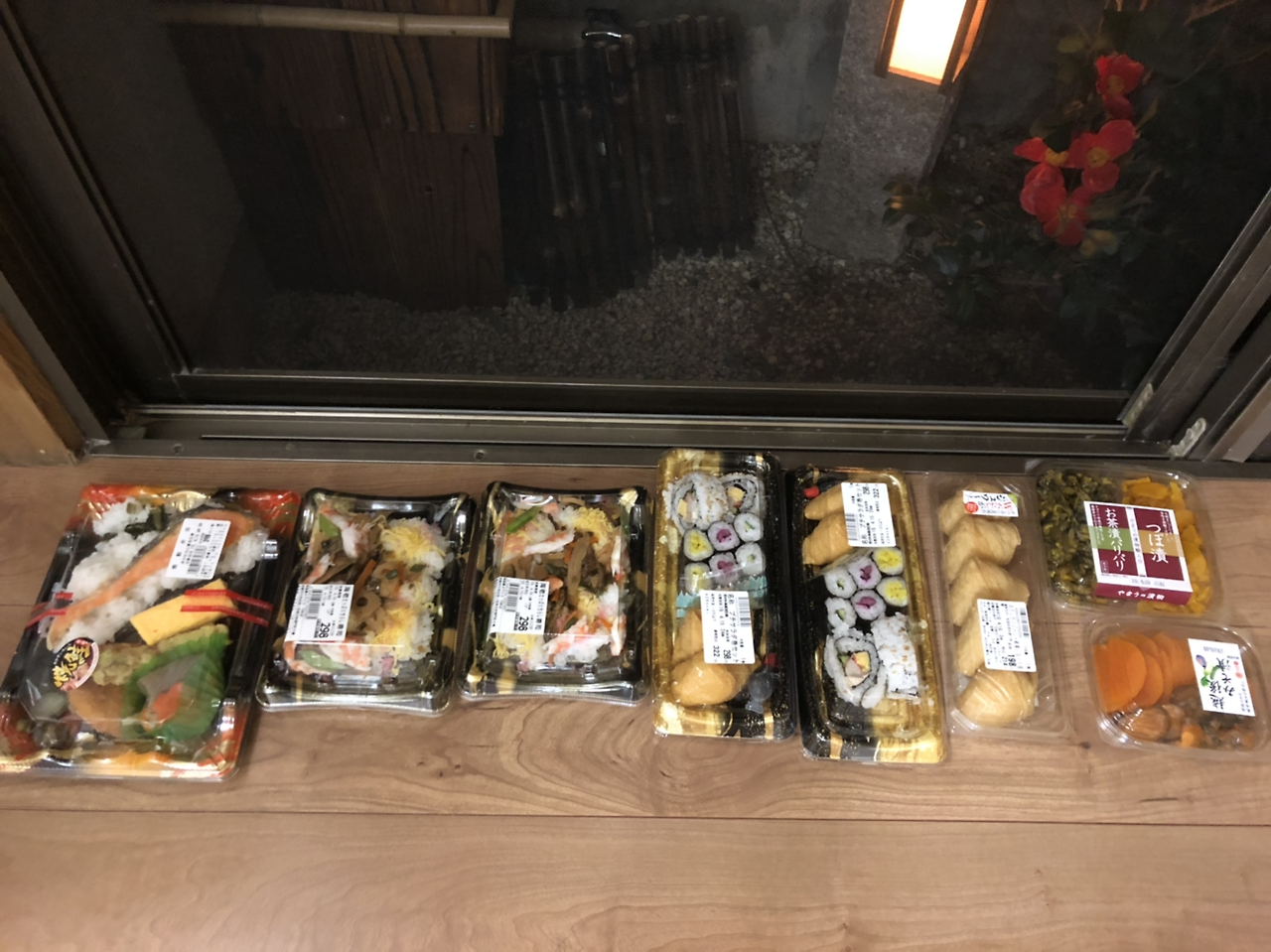 일곱 식구가 이것저것 맛볼 수 있도록, 갖가지 반찬이 있는 도시락, 유부초밥, 일본식 김밥 도시락을 골랐다. 그리고, 여행 첫날밤의 한 잔에 곁들일 안주 거리로 회와 건어물 구이를 준비했다.
