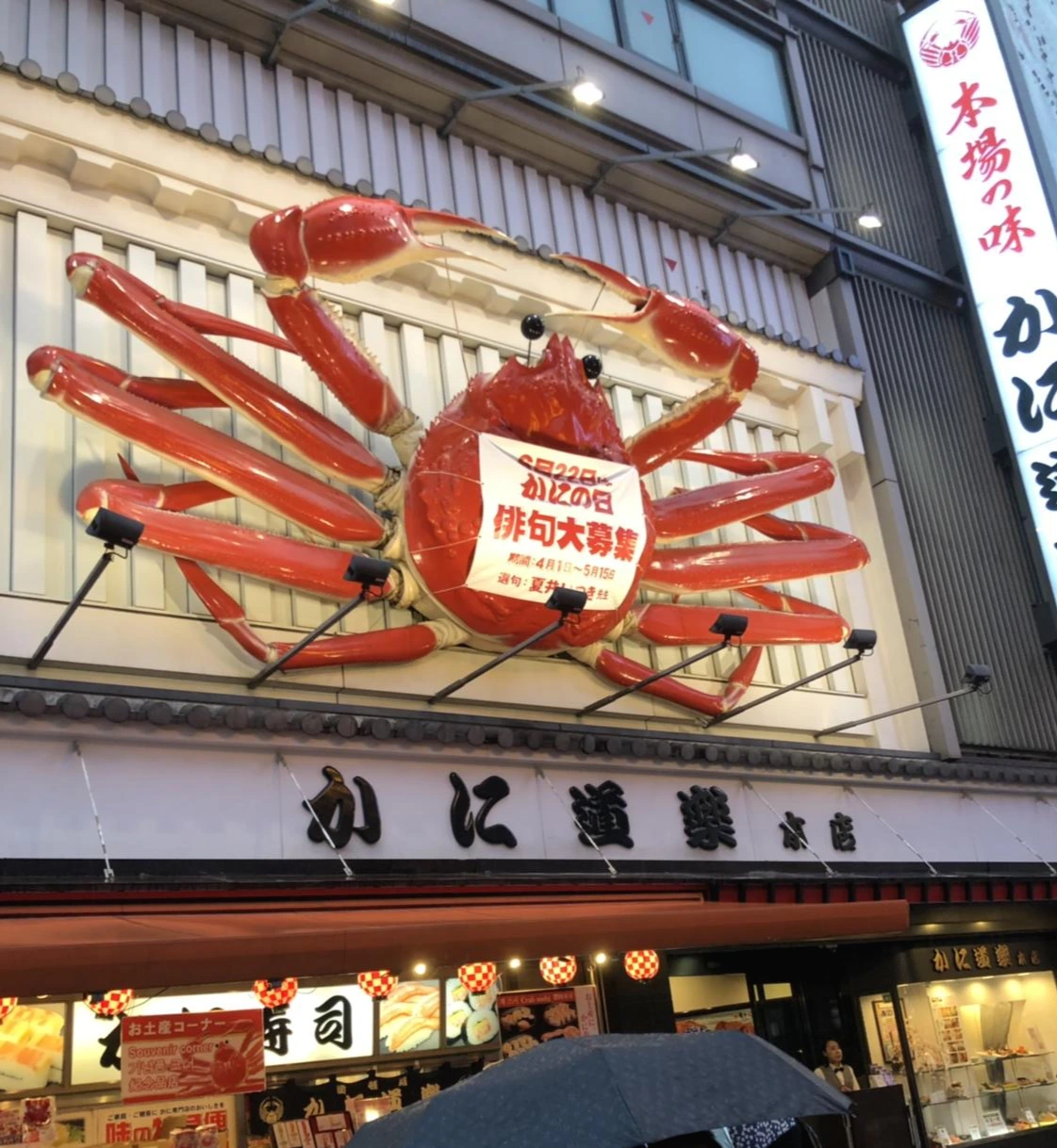 에비스바시를 건너면 대게 요리 전문점인 카니도라쿠가 있다. 식도락이 아닌 “게”도락이라는 뜻이며, 게를 재료로 한 갖가지 요리를 맛볼 수 있다.