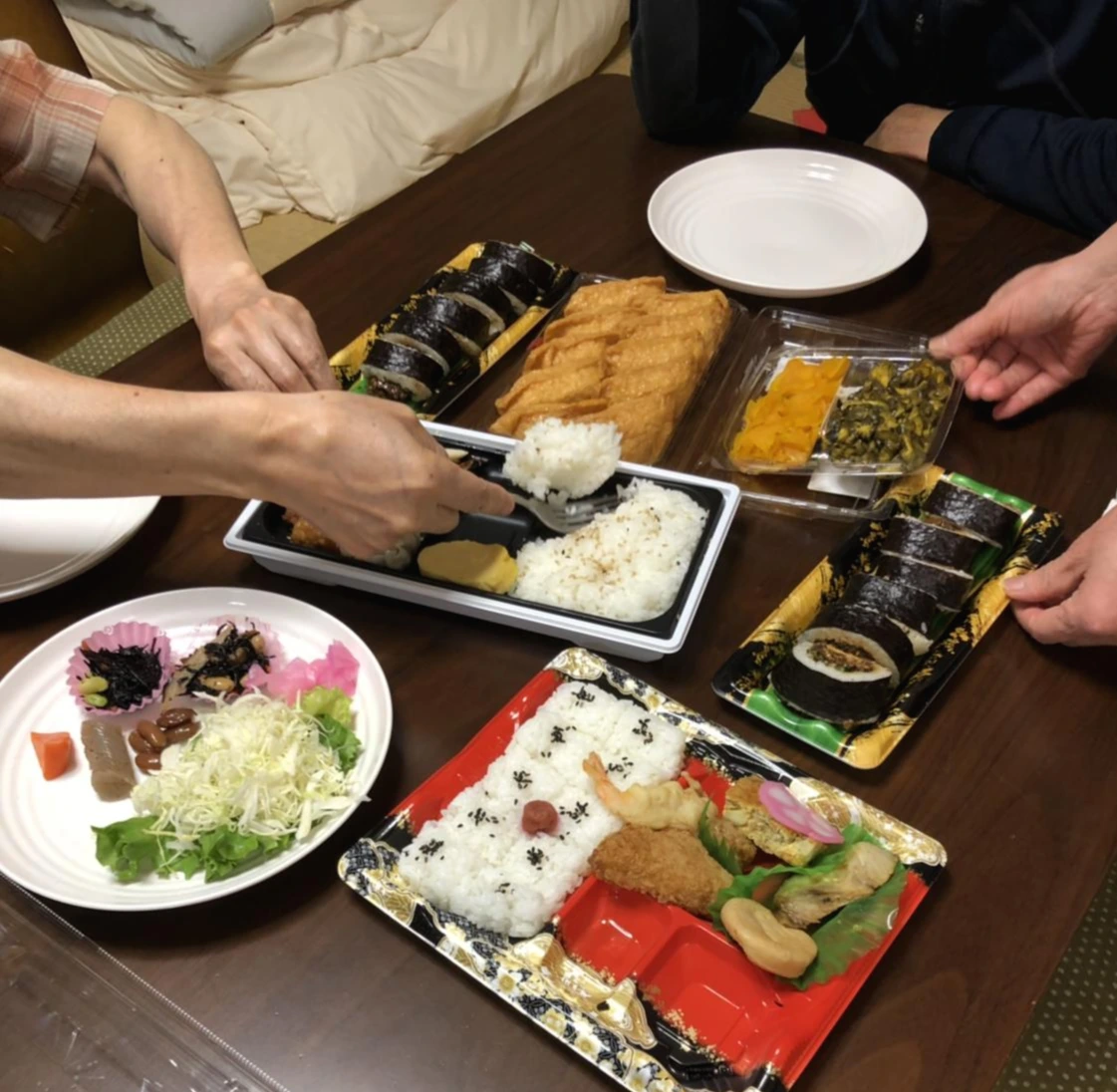 아침에 일어나 도시락을 만져본다. 적당히 시원하게 보존되고 있다. 백반, 생선 구이, 튀김 같은 반찬은 전자레인지에 돌려 따뜻하게 하고, 나머지 초밥류는 시원하게 먹는다. 도시락을 가운데 모아 놓고 각자 접시에 덜어 먹으니 조식 뷔페가 다르지 않다. 아침부터 이것저것 맛보는 재미에 웃음이 번지기 시작한다. 기대했던 도시락 조식은 대성공.