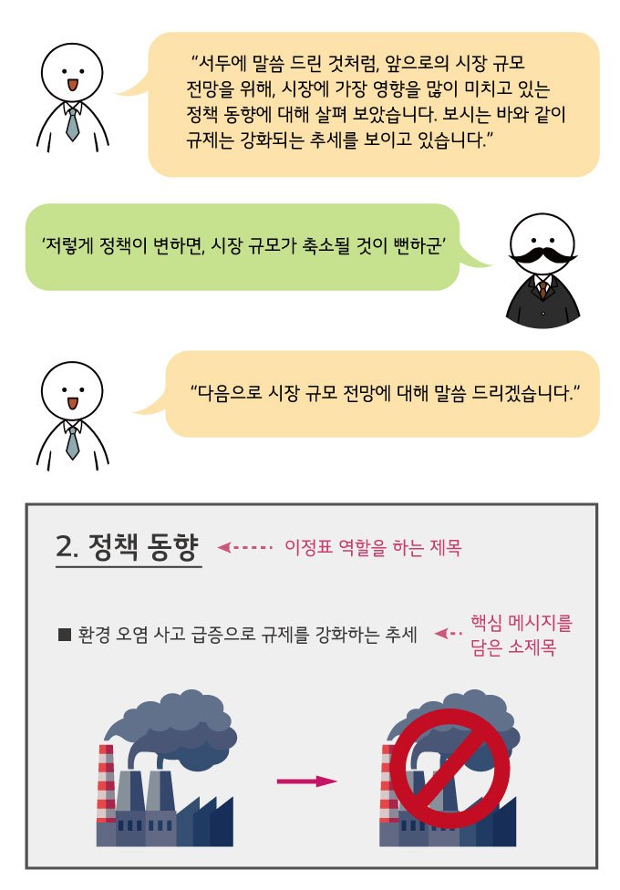 목차나 프레임워크를 각인시켰다면 이야기를 듣는 사람의 머리 속에 ‘전체 지도’의 입력이 완료된 것이다. 그러면 이야기 중간중간에 길을 이끌어 줄 ‘이정표’가 있어야 되는데, 그것이 바로 소제목이다.