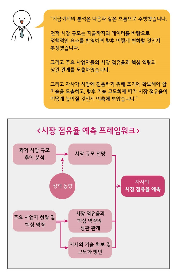 설명할 내용에 논리적인 흐름이 있거나, 복잡한 과정을 거쳐 결과를 도출한 경우에는 논리적인 흐름을 각인시킬 필요가 있다. 바로 프레임워크를 제일 먼저 펼쳐 보여서 이해, 각인시키는 것이다. 그리고 프레임워크의 흐름대로 각 단계가 제목으로 등장하면서 이야기를 풀어 나가면 된다.