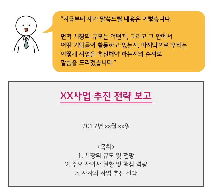본론으로 들어가기에 앞서, 목차를 먼저 설명하면서 지금부터 전할 이야기가 무엇 무엇인지, 어떤 순서로 정보를 전할 것인지를 머리 속에 심어주는 것이다.