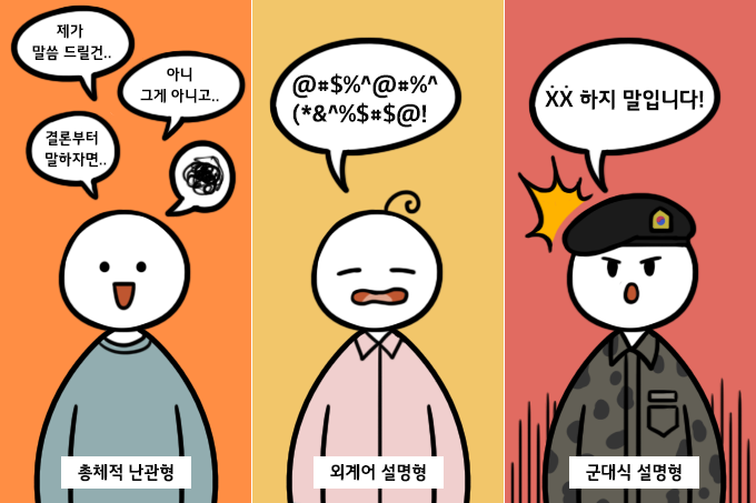 3) 군대식 설명형: 딱딱한 설명으로 듣는 사람의 사고도 경직됨