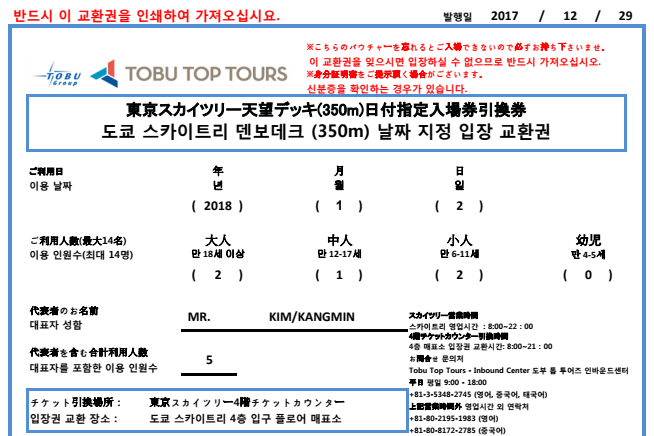 입장권은 국내 여행 사이트에서 미리 예매를 해 두었다. 현장에서 당일권을 구입할 수 있지만 줄이 상당하다고 했다. 입장권을 구입한 전망대는 350m 전망데크였고 비용은 71,800원이었다. 450m 전망대를 가려면 350m 매표소에서 입장권을 구매할 수 있다. 간혹, 입장권을 국내나 일본에서 오프라인으로 수령하는 상품도 있으나, 이메일로 교환권을 발급받으면 훨씬 편리하다. 이번에는 구매 확정한 다음날 교환권을 받았다. 날짜가 지정되어 있으나, 당일 입장하지 못하는 경우는 다음날로부터 29일 이내까지 입장이 가능하다. 우리는 예약한 당일에 방문을 했다.