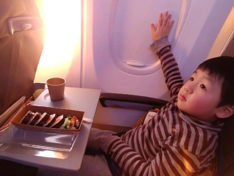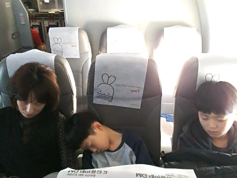 결국 5분 정도 남겨 놓고 비행기에 올라탔다. 면세품 인도장까지 다녀온 아내는 이리저리 뛰어다니느라 땀범벅이 되었다. 자리에 앉으니 노곤해진다. 저가 항공이라 기내식은 별도 구매고 값도 너무 비싸니 탑승구 앞에서 산 김밥 두 줄에 물 한 잔 얻어먹고 한숨을 돌린다. 1시간 남짓 비행하니 모자란 잠에 식구들 고개가 떨어진다.