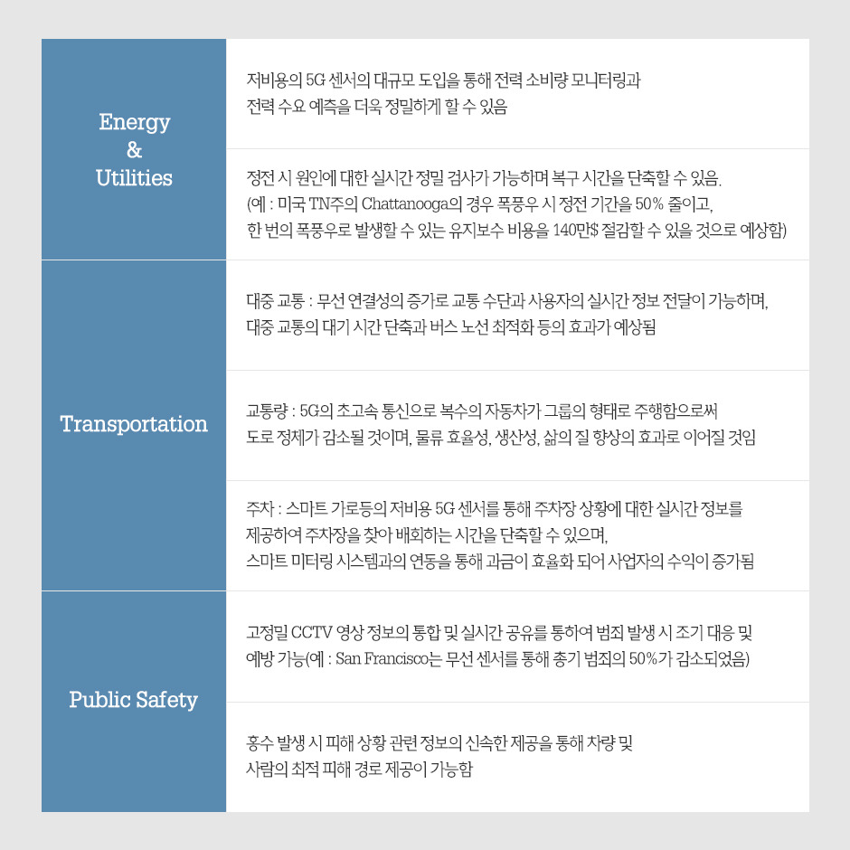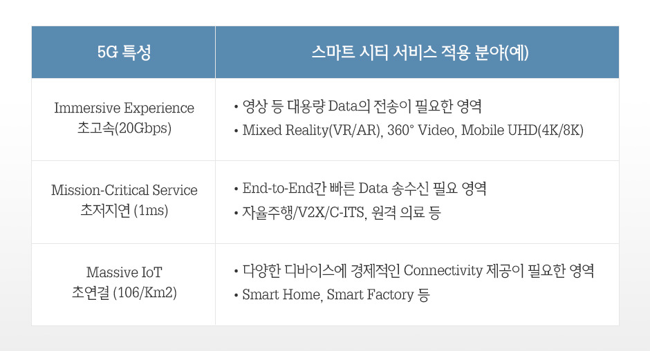 VPA는 A의 오늘 일정에 맞게 도로 교통 상황에 영향을 미치는 여러 가지 요소에 대한 정보를 융합 분석해 최적의 경로를 제안해 주었습니다. VPA가 A에게 제안한 정보는 공사와 같은 행정적인 정보부터, 도시에서 발생하는 각종 이벤트, 여기에 실제 도로상에 주행하는 자동차의 양과 예상 이동 경로까지 실시간으로 분석할 수 있었기 때문에 가능한 것입니다. 이러한 것들을 가능하게 하는 기술이 바로 5G 기술이라 할 수 있습니다. 글로벌 컨설팅 업체 엑센추어는 5G 기술이 앞으로의 도시에 미칠 영향에 대해 다음과 같이 예상합니다.