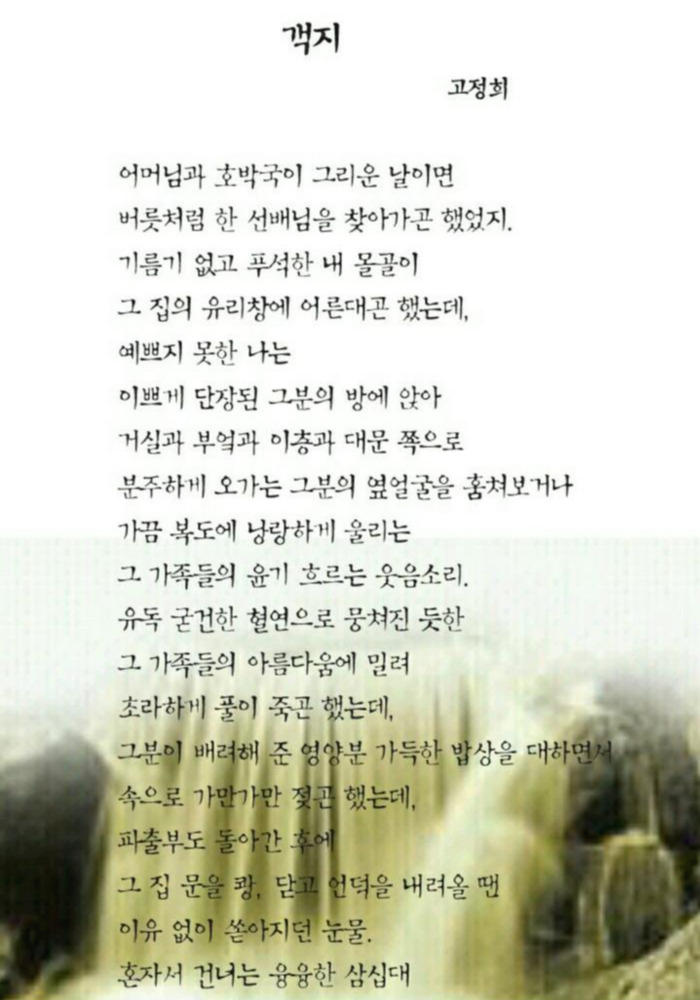내 인생에 그분이 없었으면 어쩔 뻔했나, 그분을 만나지 못했더라면 과연 지금의 나는 있을까, 상상만 해도 아찔하게 만드는 그런 소중한 분 가슴에 묻어두고 계신가요? 저에겐 예닐곱 분쯤 있는 것 같아요. 썩 내세울 건 없지만 그래도 이만큼 살게 돼 감사하다, 다 그분들 덕분이다, 이런 마음을 갖게 하는 분 말이에요.