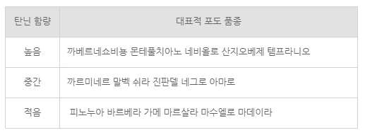 포도에 포함되어 있는 탄닌 양은 포도 품종에 따라서 다르지만 특히 까베르네 쇼비뇽, 네비올로, 쉬라, 그리고 따나(Tannat)는 가장 탄닌 함량이 높은 대표적인 4개 품종이다. 보르도 같은 많은 지역에서 생산되는 까베르네 쇼비뇽과 같은 품종은 탄닌 함량이 낮은 메를로나 까베르네프랑 등과 블렌딩되기도 한다. 화이트 와인의 경우 상대적으로 탄닌 함량이 낮기 때문에 상대적으로 보관 기간이 짧아 빨리 마셔야 한다.