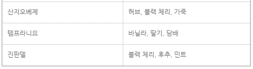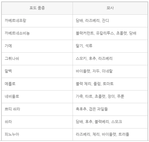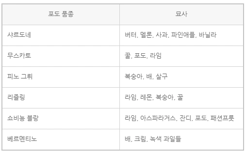 포도 품종에 따라 일반적으로 묘사되는 아로마와 맛이 있다.