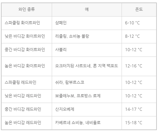 와인이 서빙되는 온도는 향과 맛에 영향을 미치기 때문에, 적절한 시음 온도일 때 테이스팅 하는 것이 좋다. 온도가 낮을수록 산미와 탄닌감이 강조되는 반면, 향이 덜 느껴질 수 있다. 높은 온도는 산도와 탄닌감이 둔화되지만 동시에 향을 더 잘 살려준다. (** 온도가 높을수록 향이 나는 분자들이 잘 증발되어, 냄새 맡기 쉬워짐)