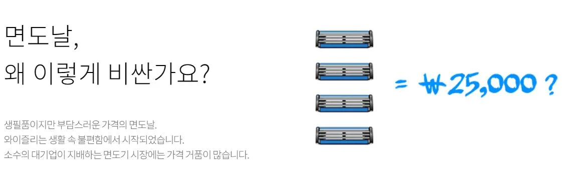2. 단순한 정기배송 서비스는 국내에서 먹히지 않는다고 생각했다. 미국같은 나라의 경우 면도날을 사려고 몇 십분씩 운전을 해야하는 경우도 있어 비교적 정기배송 서비스가 활용되고 있는 상황이다. 하지만 우리는 다르다. 퇴근하고 집에 가는 길 곳곳엔 편의점도 있고, 올리*영 같은 드러그스토어도 있다. 굳이 정기 배송을 시키지 않더라도 언제든 면도날을 구매할 수 있는 환경이기 때문에 다른 차별 포인트가 필요하다.