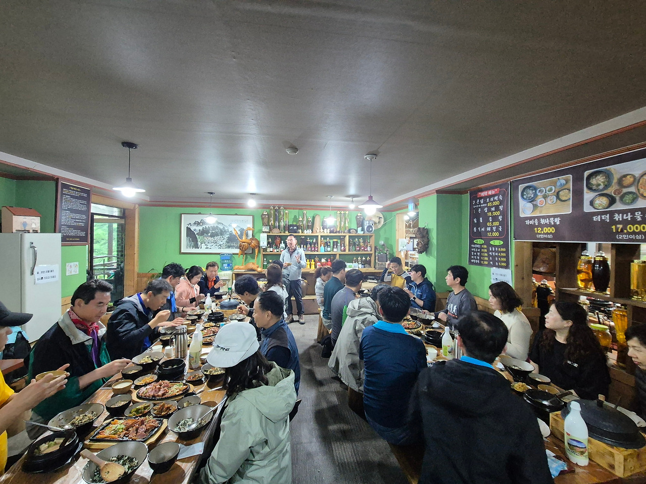 누군가가 내뱉은 말 한마디가 우리 모두의 마음을 대신해주었다. 우리는 그렇게 다시 내려와, 뒷풀이 장소인 '샛고랑펜션식당'에 도착했다. 훈훈한 실내, 따뜻한 음식, 푸짐한 대화. 취나물 솥밥과 더덕, 훈제오리구이는 오늘의 산행을 완성하는 마지막 퍼즐 조각이었다.