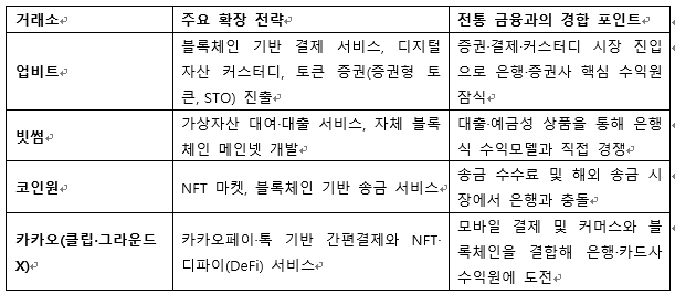 국내 거래소들은 거래 수수료 중심의 기존 모델에서 벗어나 커스터디·대출·결제·토큰 증권 등으로 확장하며 전통 금융의 핵심 영역—예금, 대출, 결제—을 직접 공략하고 있다.