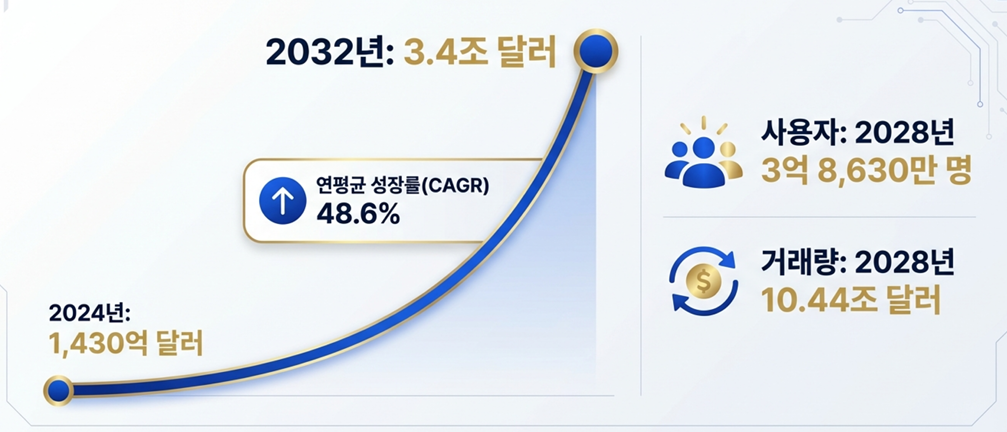 2024년 1,430억 달러로 평가된 글로벌 크립토 네오뱅크 시장이 2032년 3.4조 달러까지 커질 것으로 예상되며, 연평균 성장률이 48.6% 수준이라는 전망은 단순한 낙관론이라 치부하기 어렵다. 이 정도면 “새로운 산업”이 아니라 “기존 산업의 중심축 이동”에 가깝다.